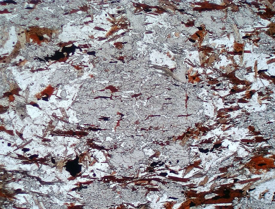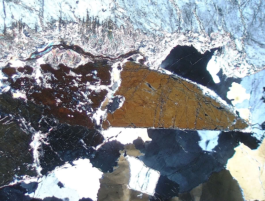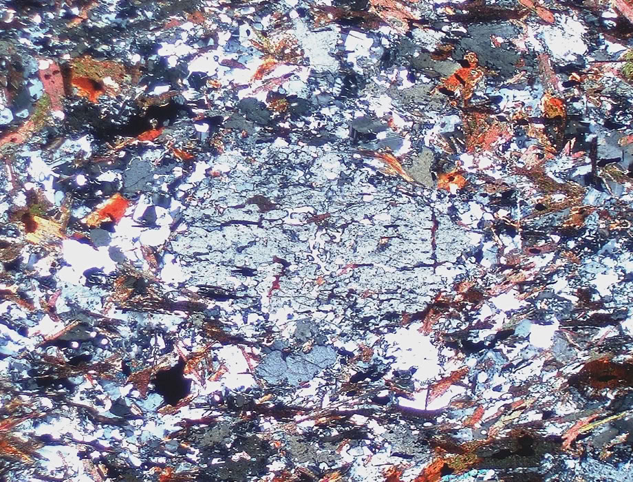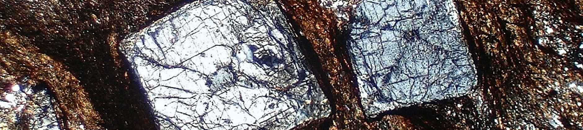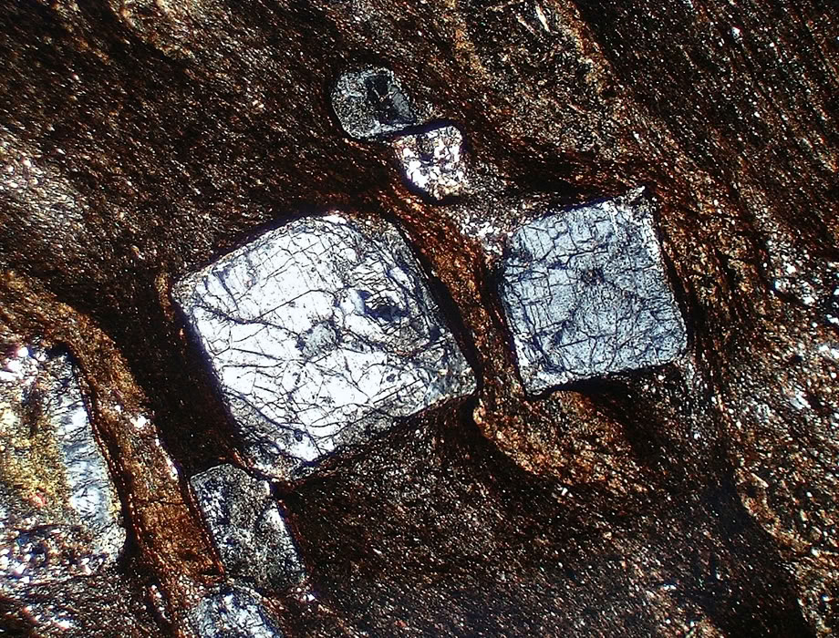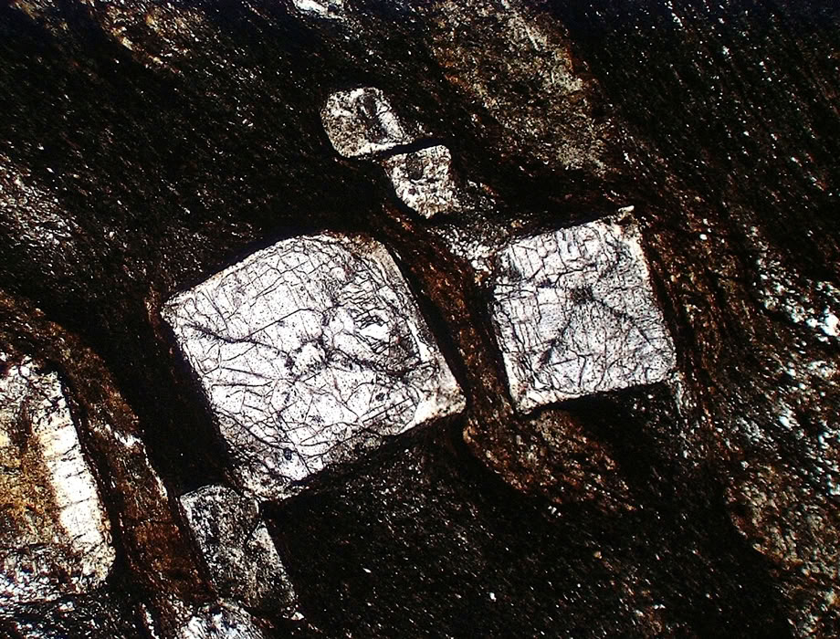 Cristales xenomorfos de andalucita en una corneana (biotita, cuarzo, moscovita, sillimanita, min. opacos).