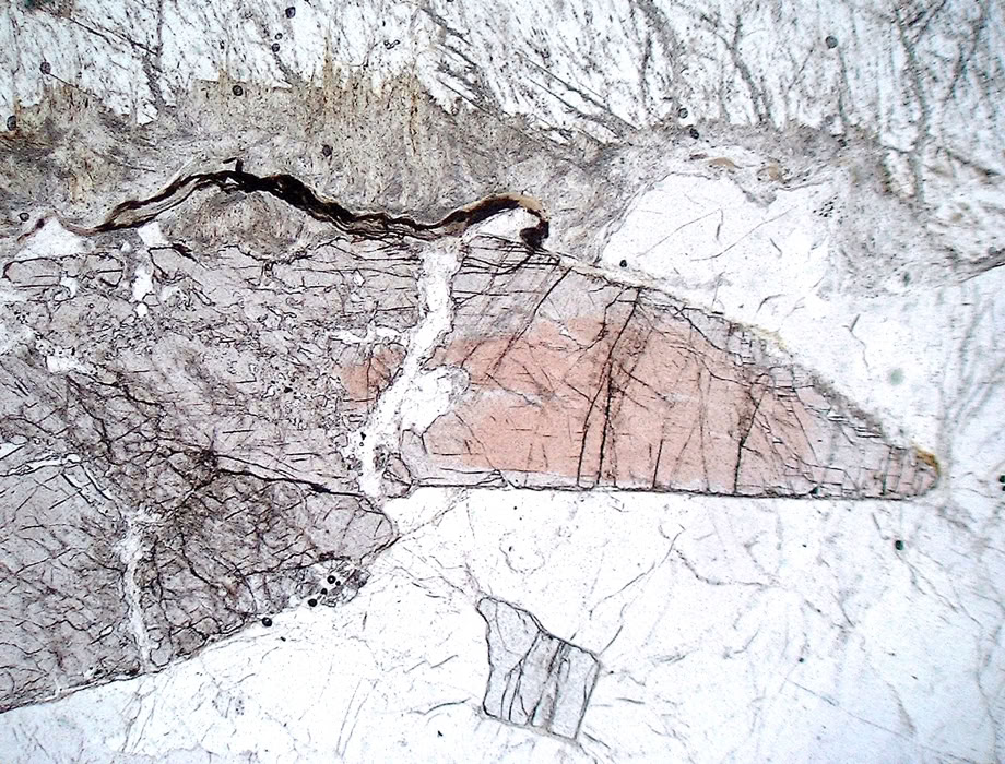 Cristal de andalucita con zonación de color (rosa) y pleocroico en una pegmatita (cuarzo, microclina, moscovita, plagioclasa, turmalina).