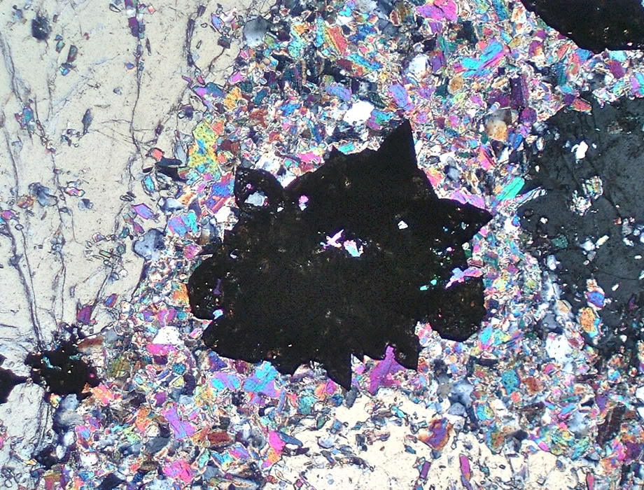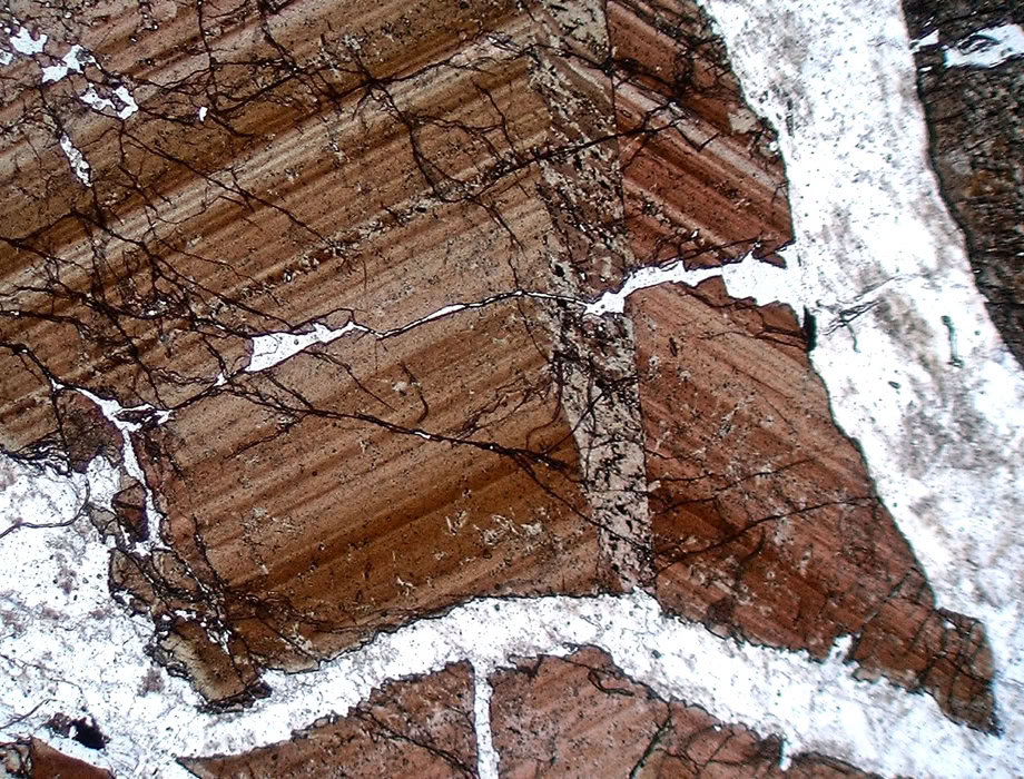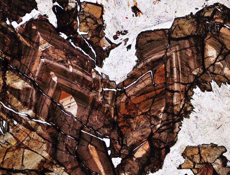 Cristales zonados de casiterita en un dique de cuarzo, (cuarzo micas de litio).