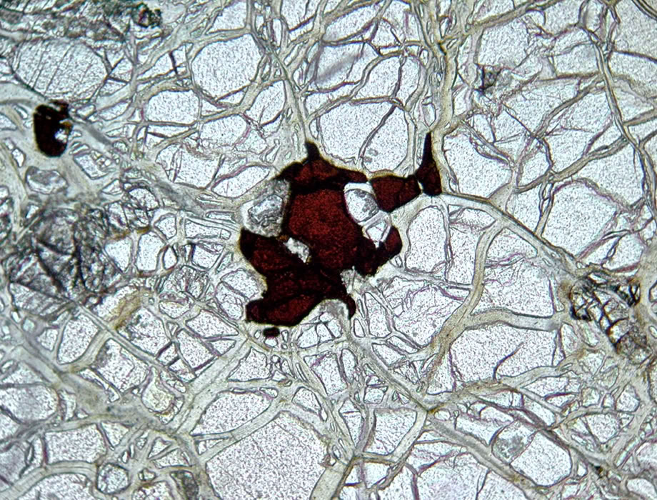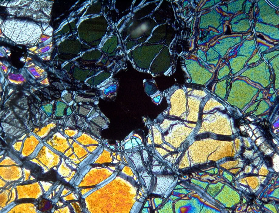 Cromita en una peridotita (olivino, serpentina, ortopiroxeno).