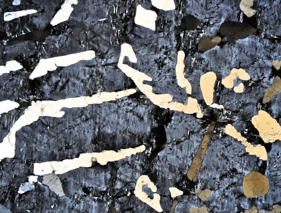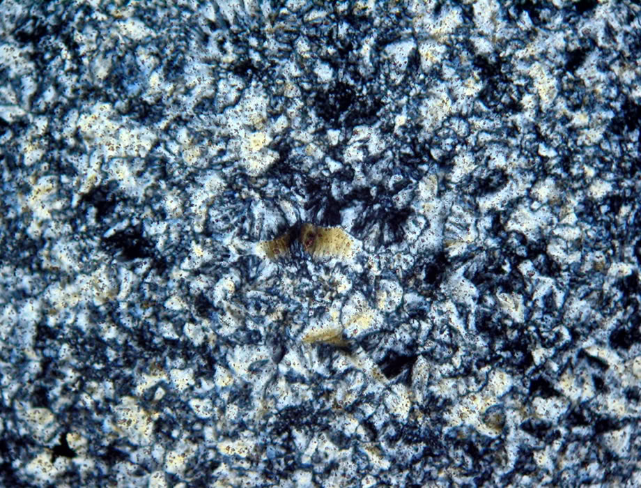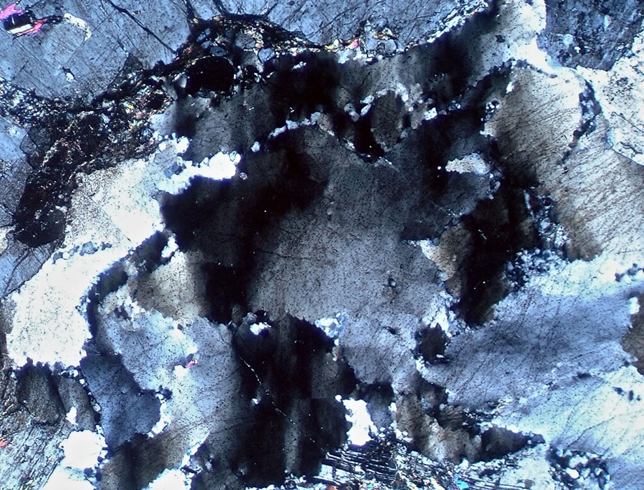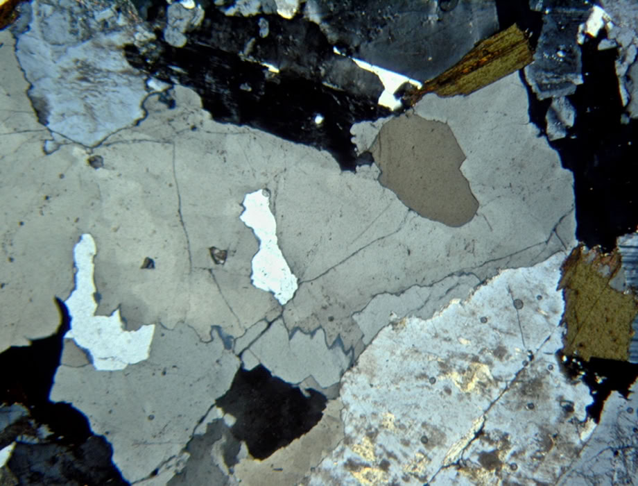 Imagen tomada con polarizadores cruzados. La baja birrefringencia da lugar a colores de interferencia bajos (grises y blancos de primer orden).