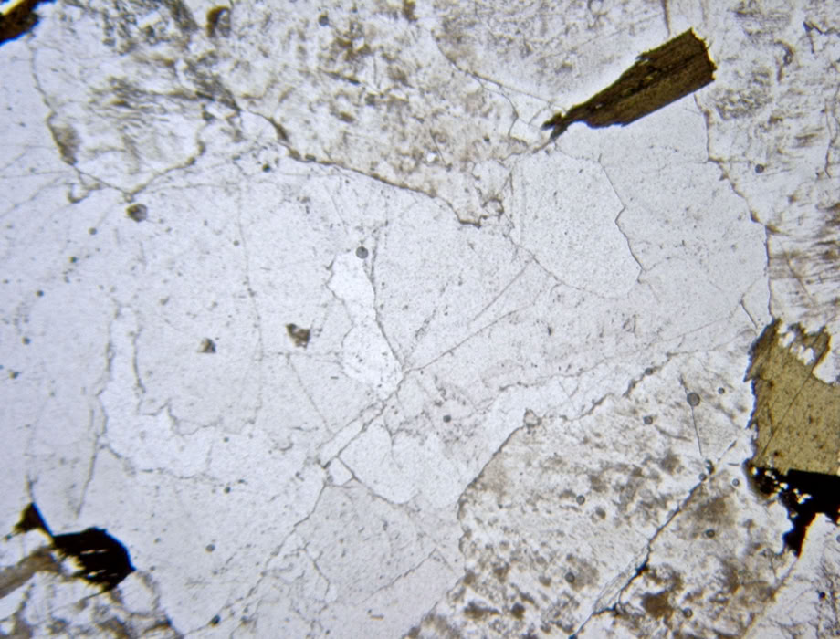 OTROS DATOS: Inalterable. Por deformación, frecuentemente presenta extinción ondulante y signo biáxico con 2V hasta 10°. Puede presentar texturas gráficas (cristales con la misma orientación óptica) con feldespatos (microclina) y texturas mirmekíticas con plagioclasas