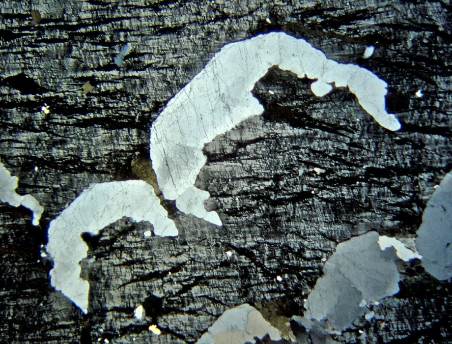 Imagen tomada con polarizadores cruzados. Los granos de cuarzo deformado pueden mostrar extinción ondulante y tener signo óptico biáxico positivo (con ángulo 2V pequeño).