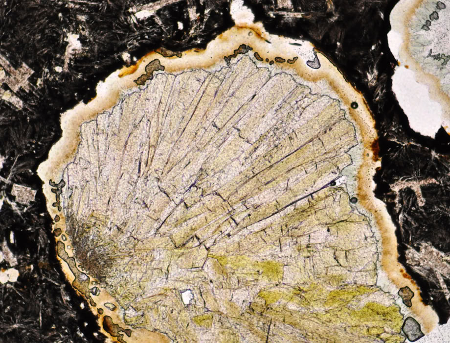 Epidota de color amarillento en una vacuola de un basalto (plagioclasa, piroxeno, clorita, prehnita, pumpellyíta).