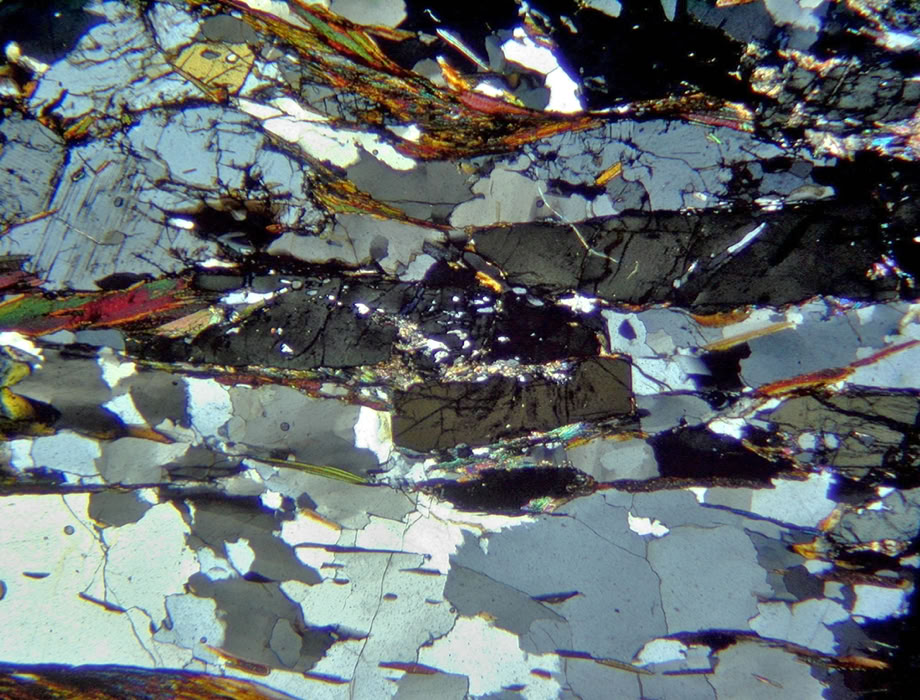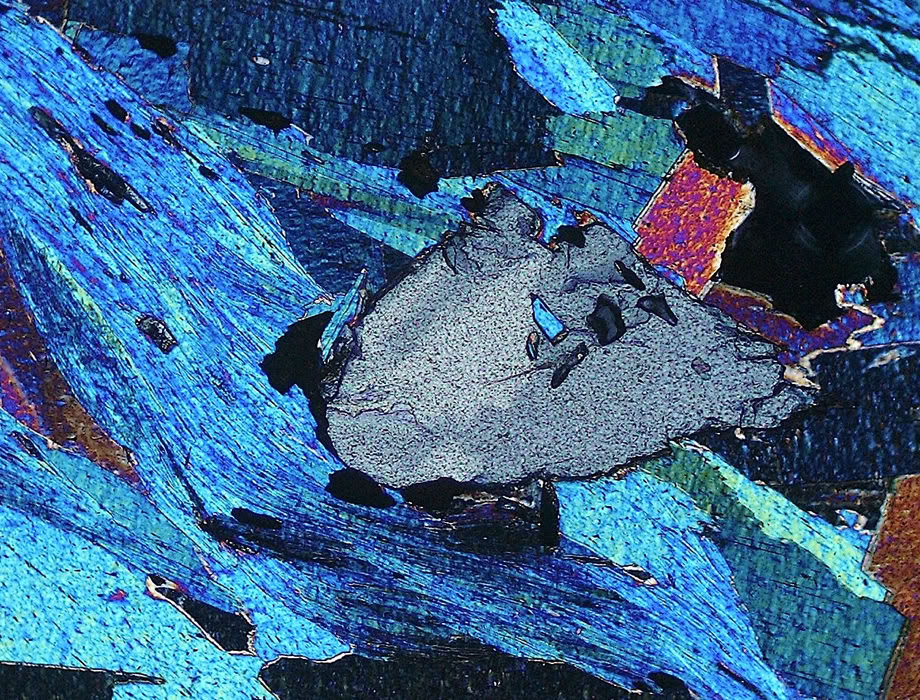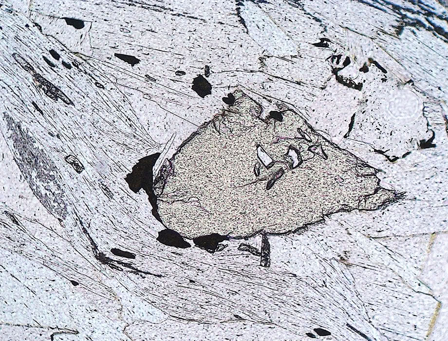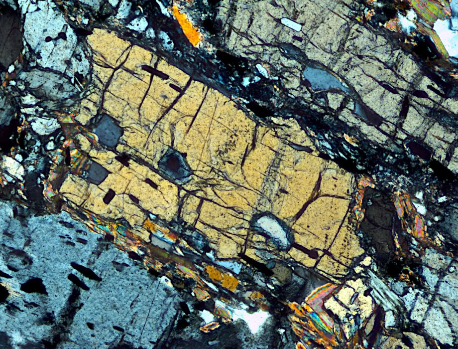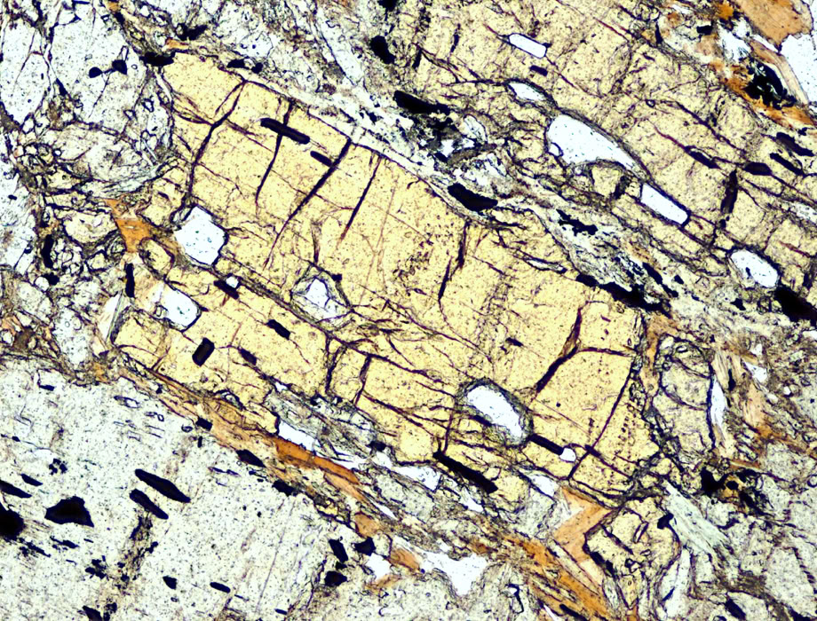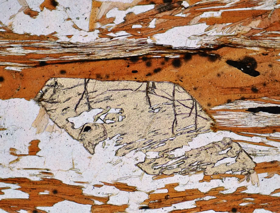 Cristal subautomorfo de estaurolita en un esquisto (cuarzo, biotita,, moscovita, plagioclasa, feldespato potasio, turmalina, zircón y min. opacos).