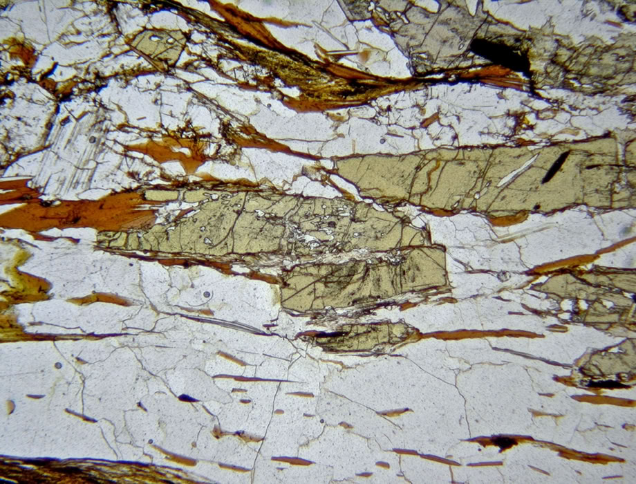 Estaurolita en un esquisto (cuarzo, biotita, moscovita, plagioclasa, granate)