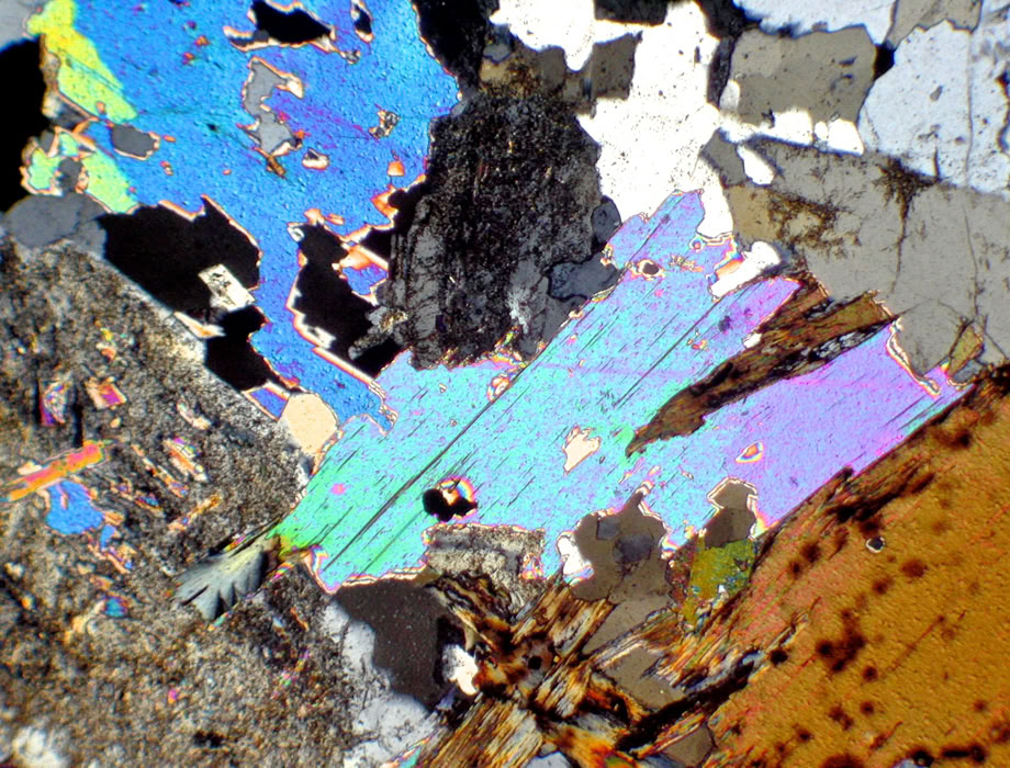Cristales de diópsido, la variación en los colores de interferencia se debe a las diferentes orientaciones de las secciones de los cristales.
