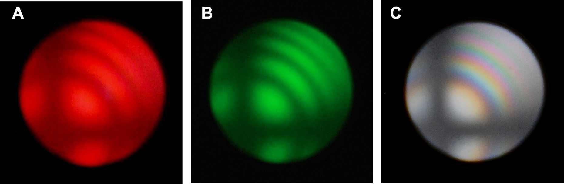 Figura de interferencia uniáxica observada utilizando diferentes tipos de luz : monocromática roja (A), monocromáitca verde (B) y luz blanca policromática (C).
