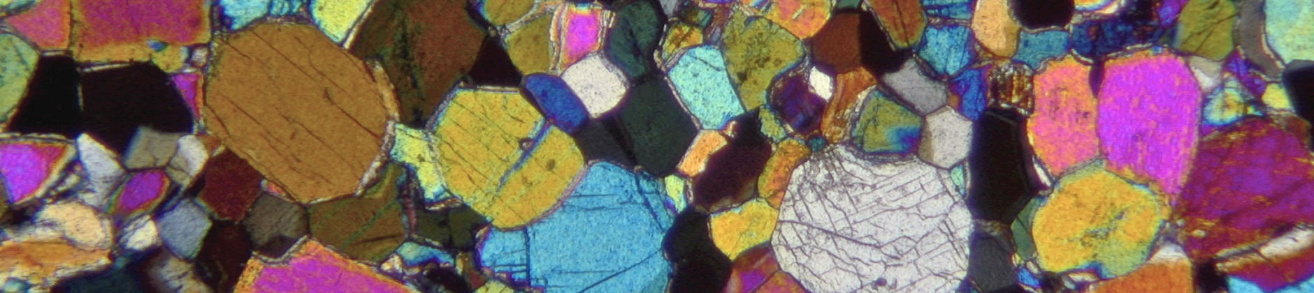 Colores de inteferencia bajos, gris-blanco de primer orden (birrefringencia baja= 0.009) en cristales xenomorfos de cuarzo. Polarizadores cruzados.