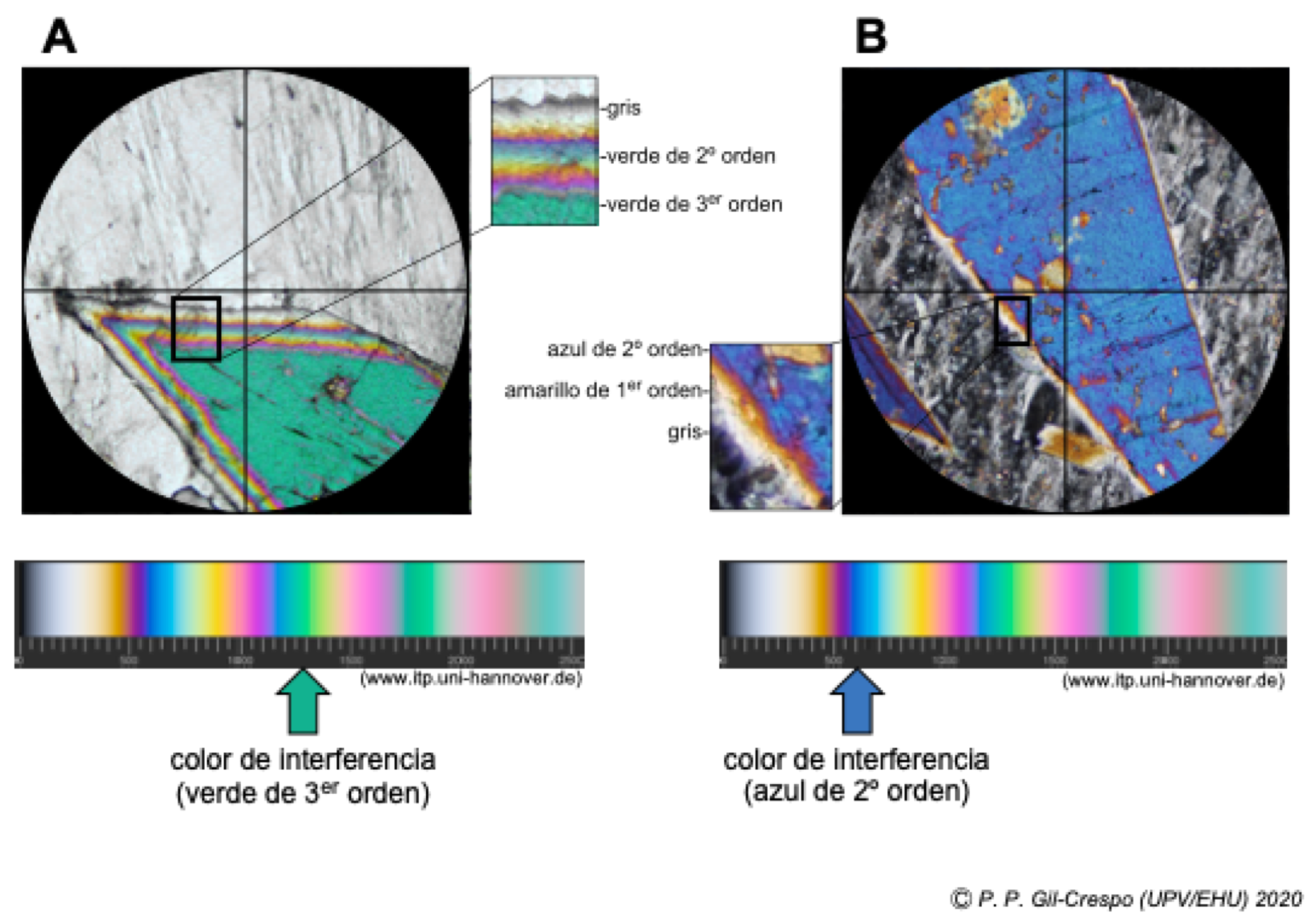 Identificación del color de interferencia los bordes de grano adelgazado. En A: el color de interferencia es el 2º verde, de tercer orden; en B: el color de interferencia es el primer azul, de 2º orden.