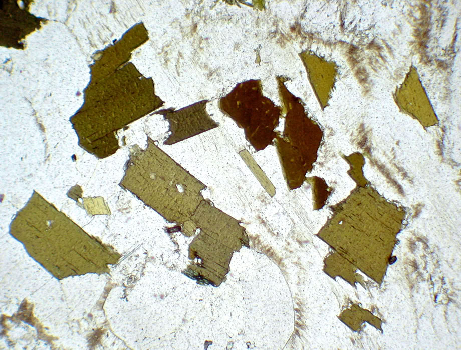 Cristales subautomorfos (alargados y presentando alguna de las caras), con hábito planar) de biotita en una roca granítica. Luz polarizada plana.