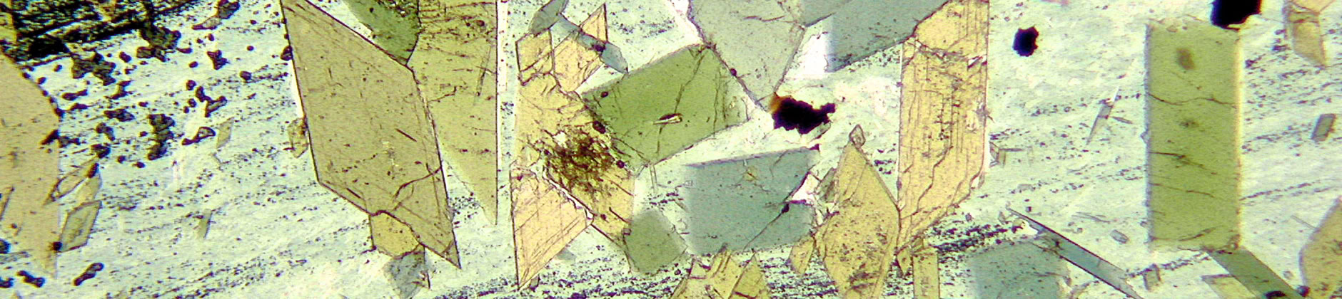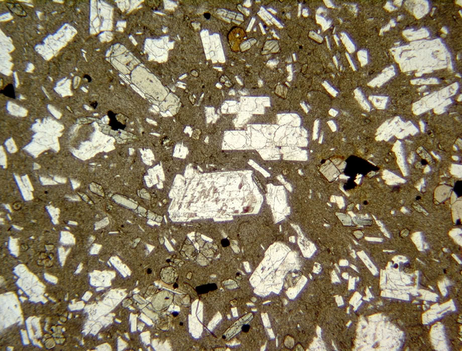 Granos automorfos de plagioclasa (incoloro) y de enstatita (verde claro) en una matriz vítrea de una roca volcánica. Luz polarizada plana.