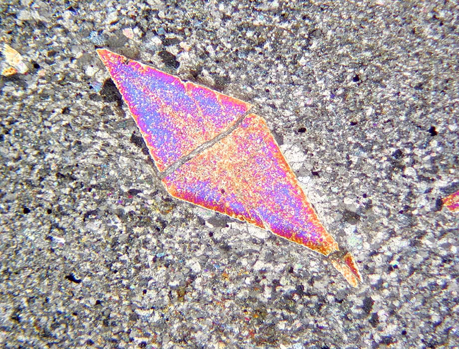 Cristales automorfos de escapolita en un mármol. Polarizadores cruzados.