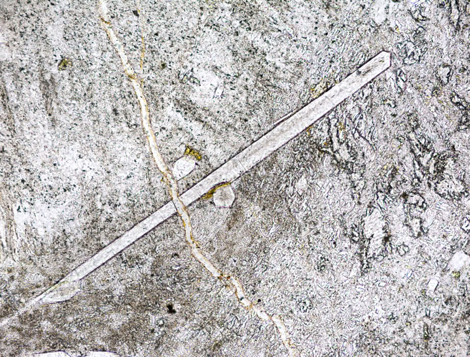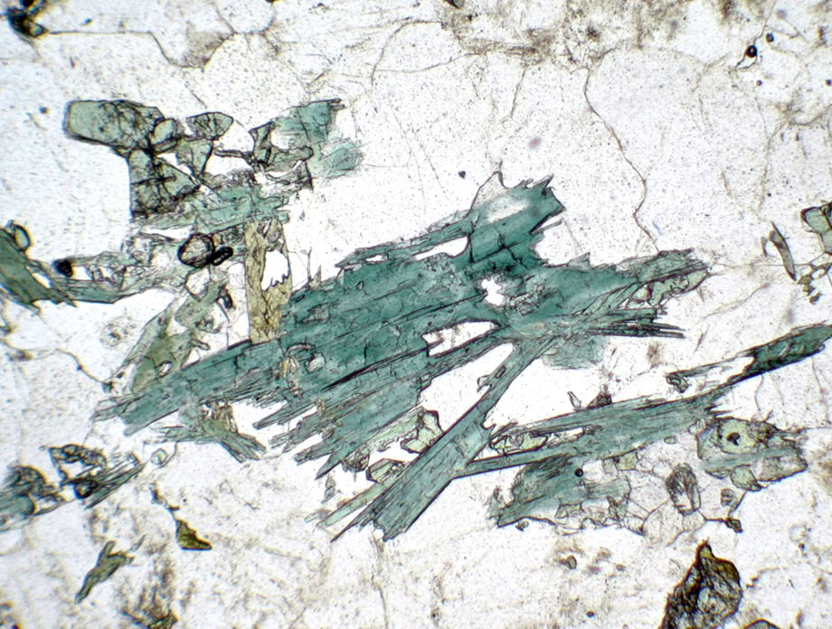Cristales subautomorfos (alargados pero sin caras bien definidas) de actinolita en un skarn. Luz polarizada plana.