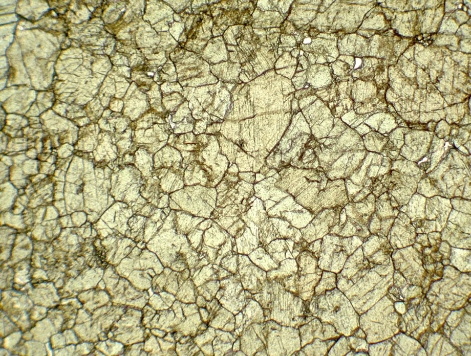 Agregado granular de cristales xenomorfos de piroxeno (serie diópsido-hedenbergita). Luz polarizada plana.
