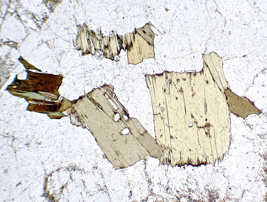 Relieve medio (positivo), en la biotita (n= 1.6-1.7) los límites de grano se aprecian con claridad. Luz polarizada plana.