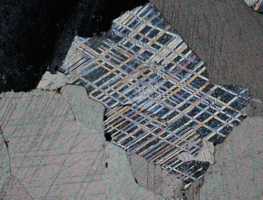 Maclas de enrejado (en tartán o tela escocesa) en diferentes granos de microclina. Polarizadores cruzados.