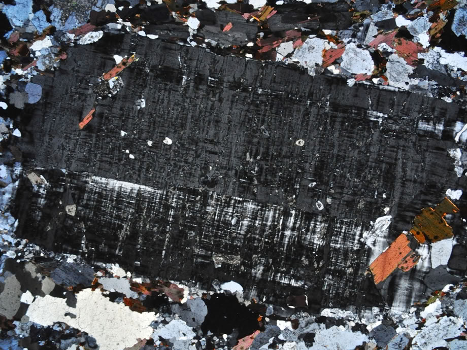 Maclas lamelares simples en un cristal automorfo de un clinopiroxeno tipo augita. Polarizadores cruzados.