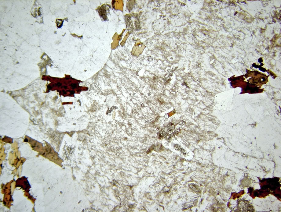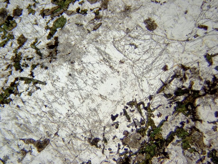 OTROS DATOS: Algunas veces pertítica, comúnmente criptopertítica. Alteración fácil a sericítica (cristales muy pequeños de minerales de la arcilla, a veces ultramicroscópicos, dando aspecto sucio)