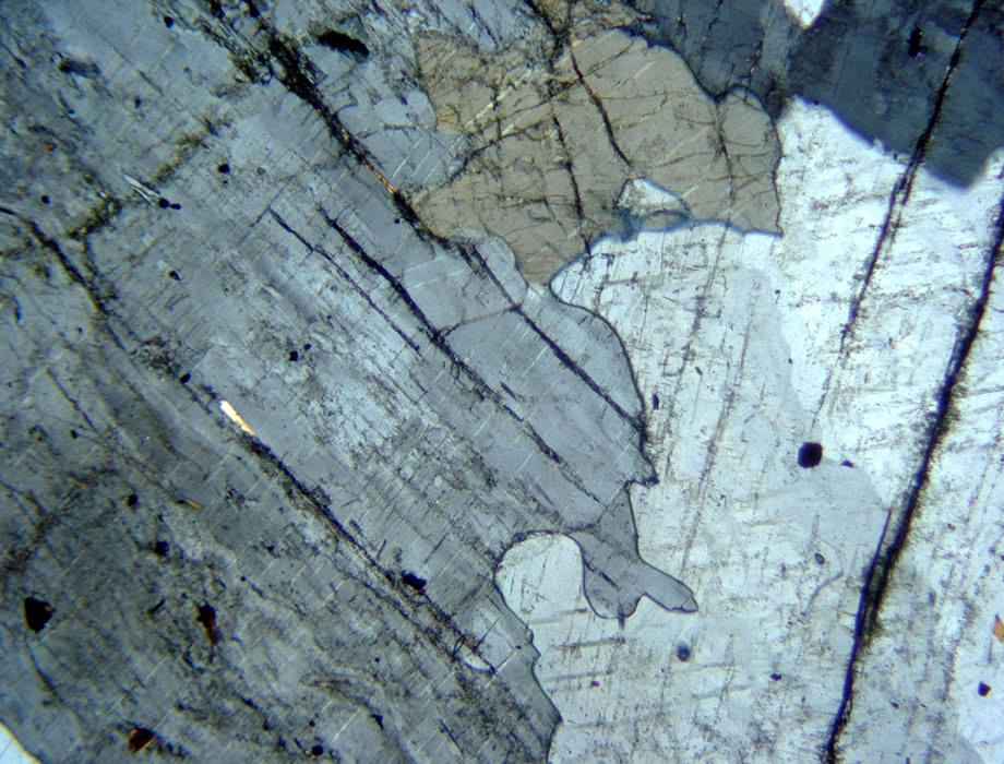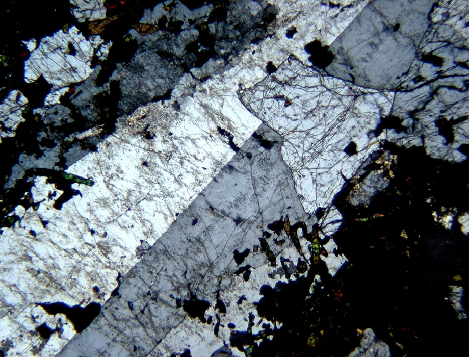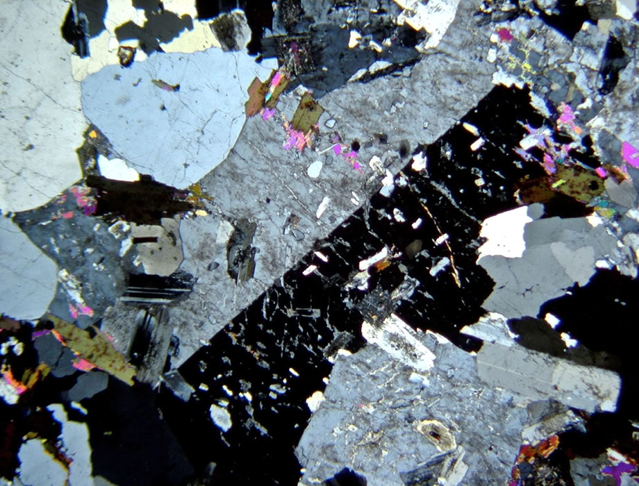 Imagen tomada con polarizadores cruzados. Se observa un cristal grande de nefelina en la parte superior derecha de la imagen.