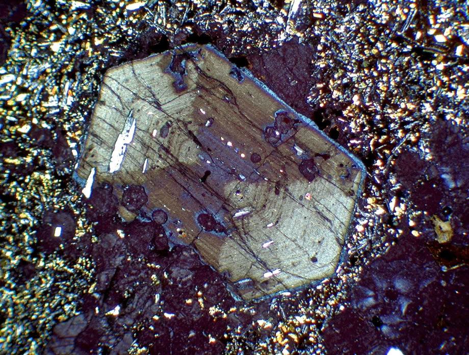 Augita automorfa mostrando zonación composicional concéntrica en bandas finas y zonado en reloj de arena “hour glass”. Polarizadores cruzados.