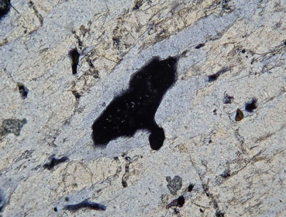 Sodalita con ligera tonalidad azulada en granos xenomorfos en una sienita (ortoclasa, apatito, biotita).