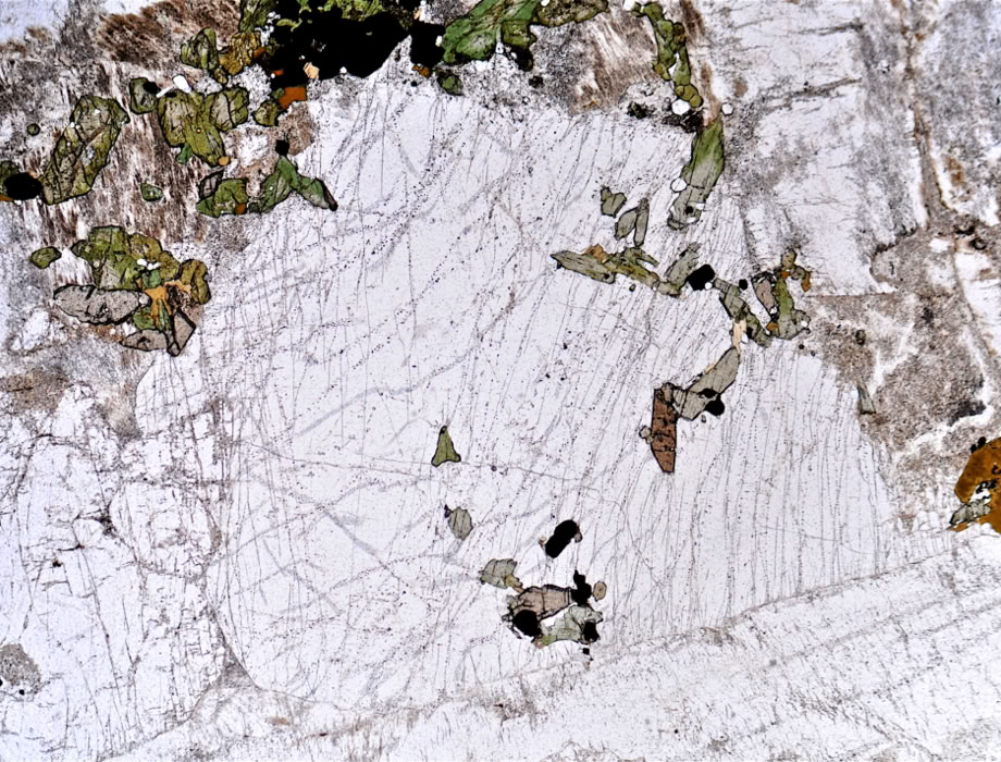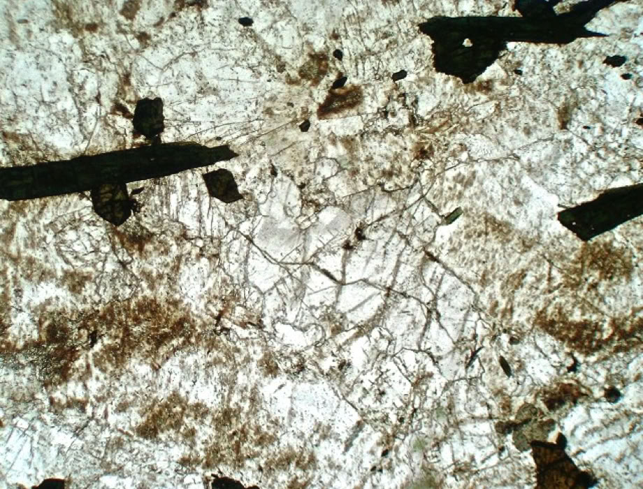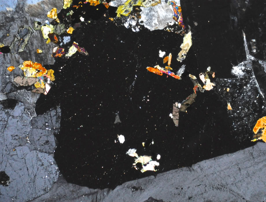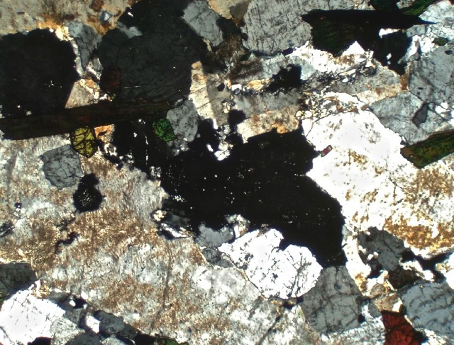 Sodalita en cristales xenomorfos con ligera tonalidad azulada, en una sienita (ortoclasa, nefelina, olivino, kaersutita, apatito, biotita).