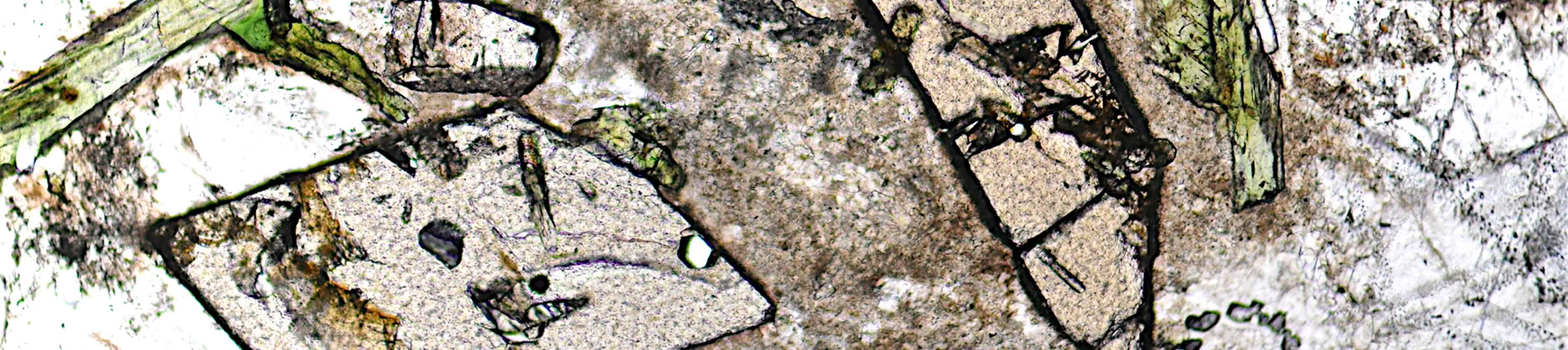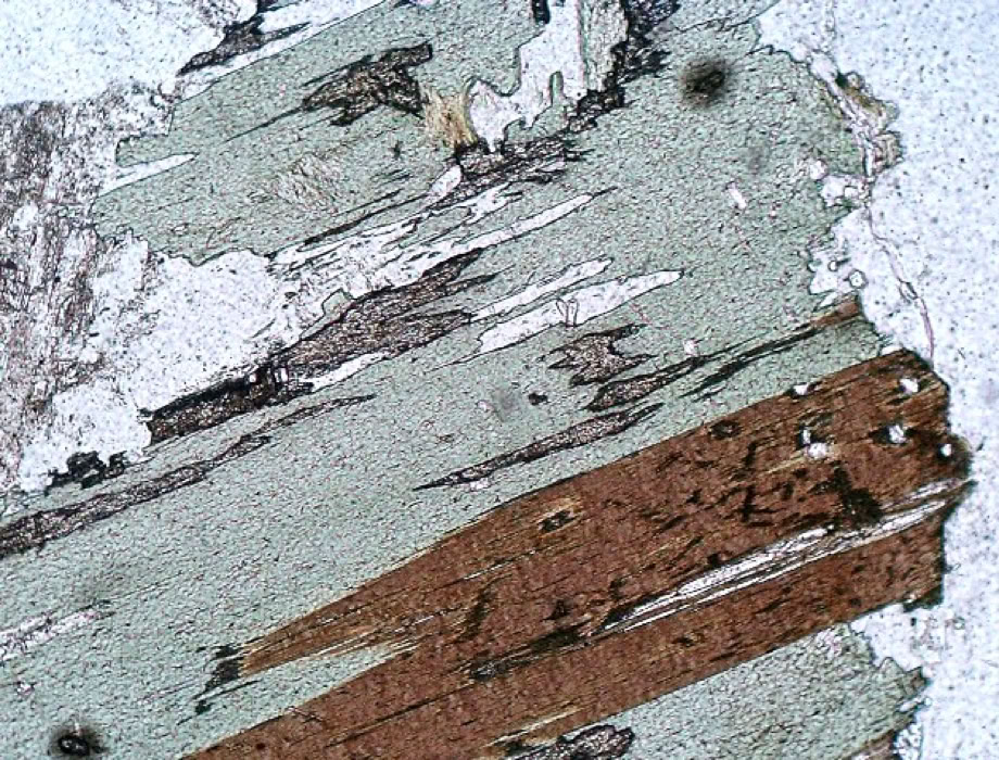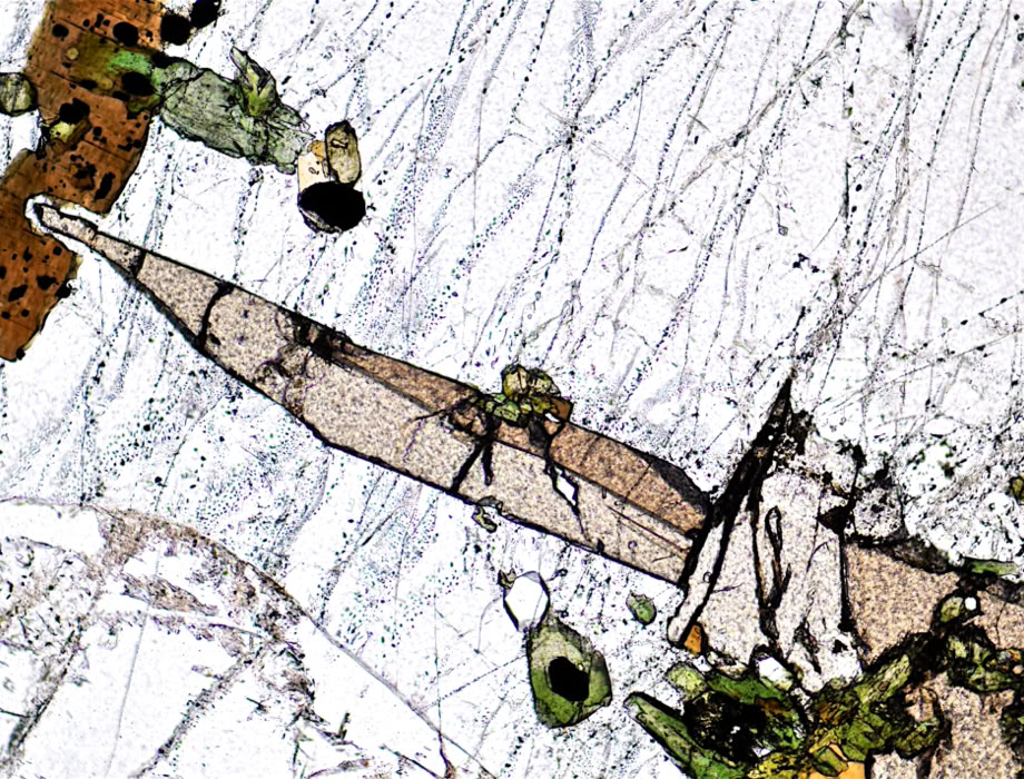 Titanita secundaria formada durante la cloritización de biotita en una granodiorita (cuarzo, plagioclasas, microclina, apatito).