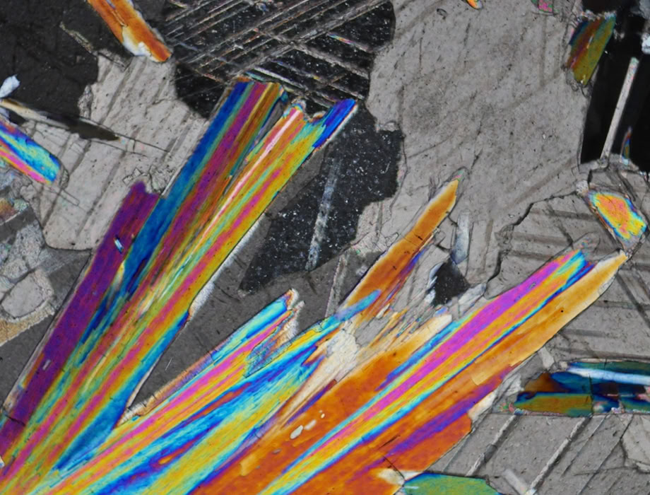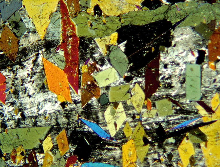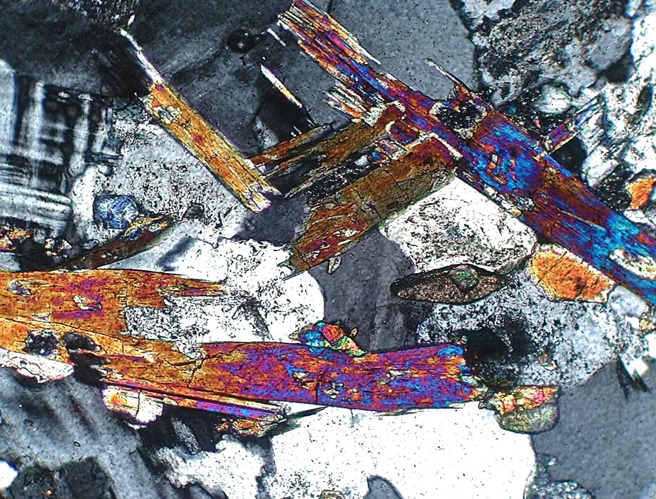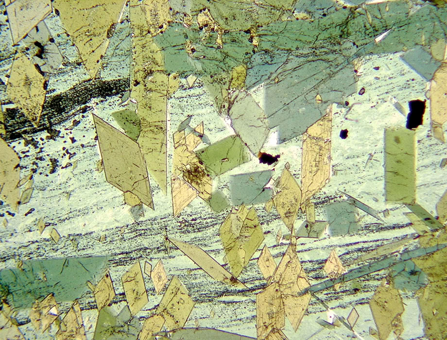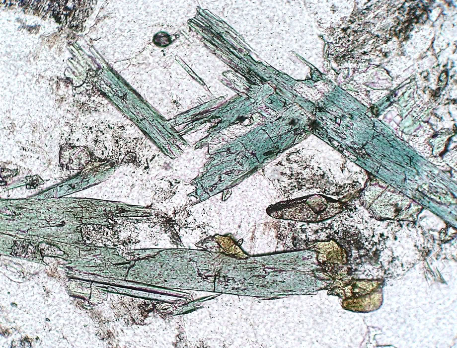 Cristales automorfos de actinolita en un esquisto (clorita, cuarzo, titanita, minerales opacos).