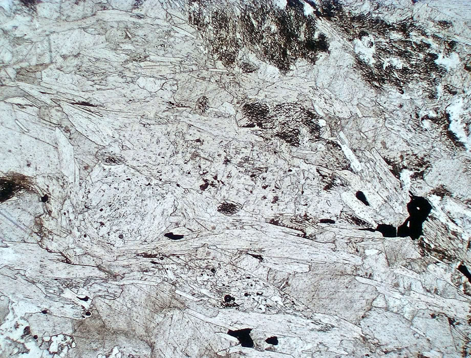 Tremolita incolora en un mármol (con carbonatos, moscovita, diópsido).