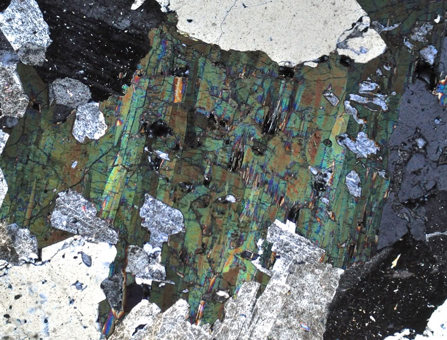 Cristales de turmalina tipo chorlo con zonaciones de color complejas en una cavidad miarolítica de una rgranodiorita (cuarzo, plagioclasa, biotita, feldespato potasico, epidota, clorita, titanita, minerales opacos, zircón).