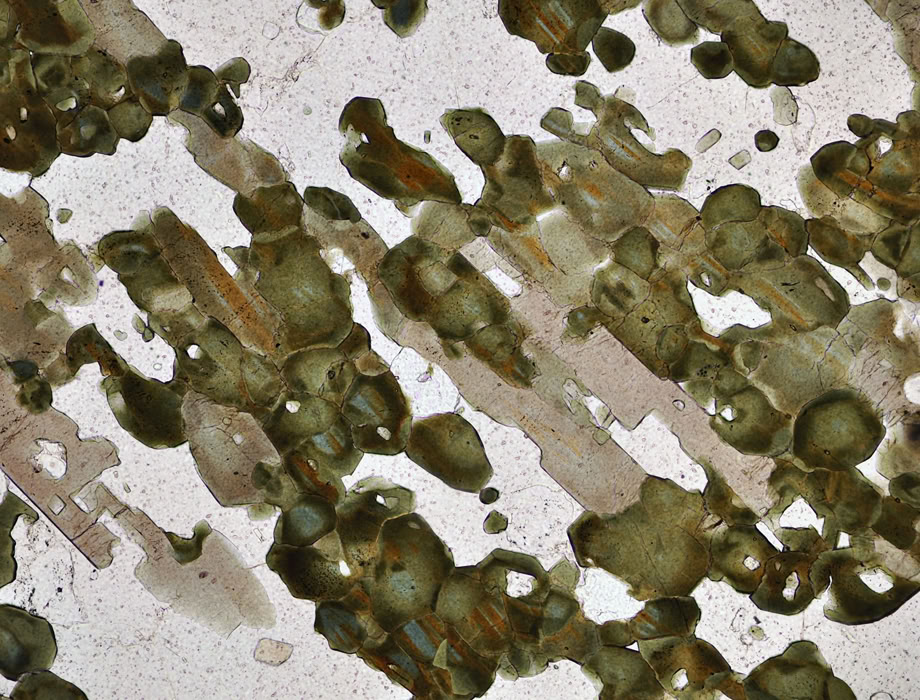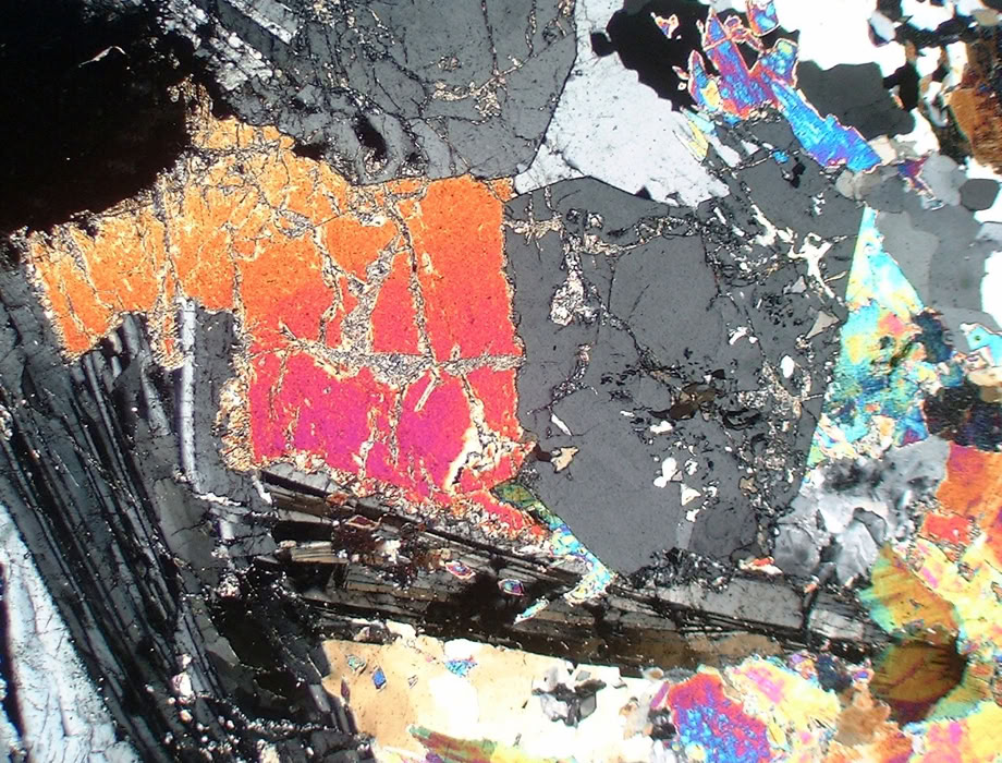 Misma zona, con polarizadores cruzados. La sección basal de la imagen presenta un comportamiento isótropo.