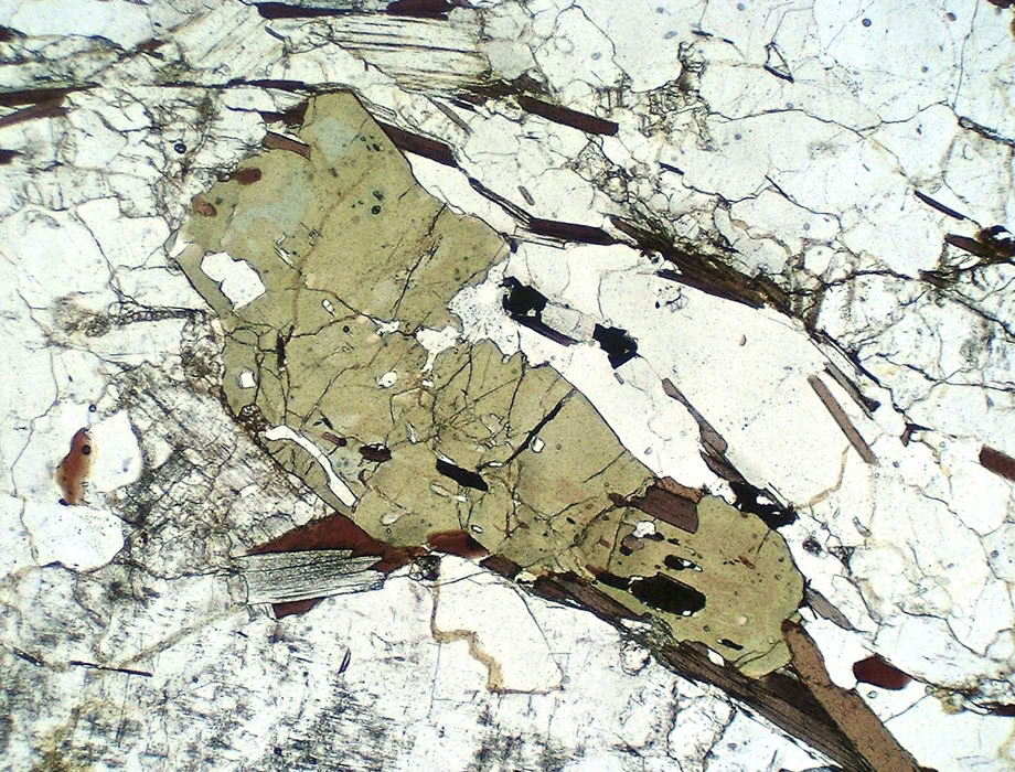Cristal xenomorfo de turmalina (chorlo-dravita) en un gneiss (cuarzo, feldespato potásico, plagioclasa, biotita, moscovita).