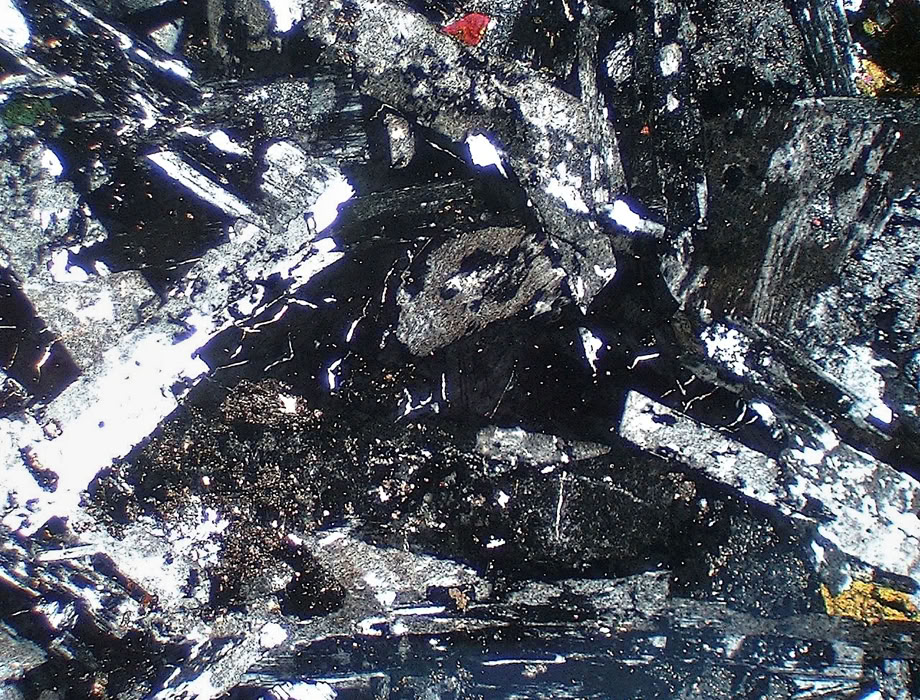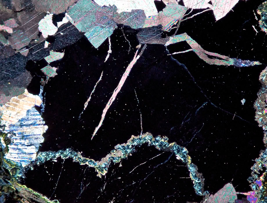 Misma zona, con polarizadores cruzados, se observa el carácter isótropo de la analcima.