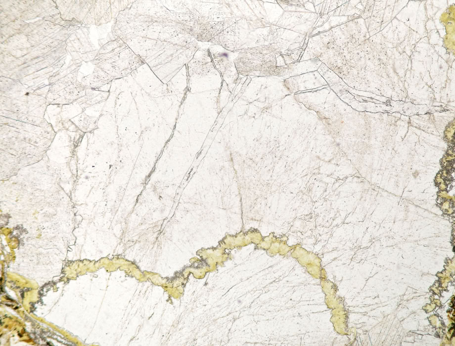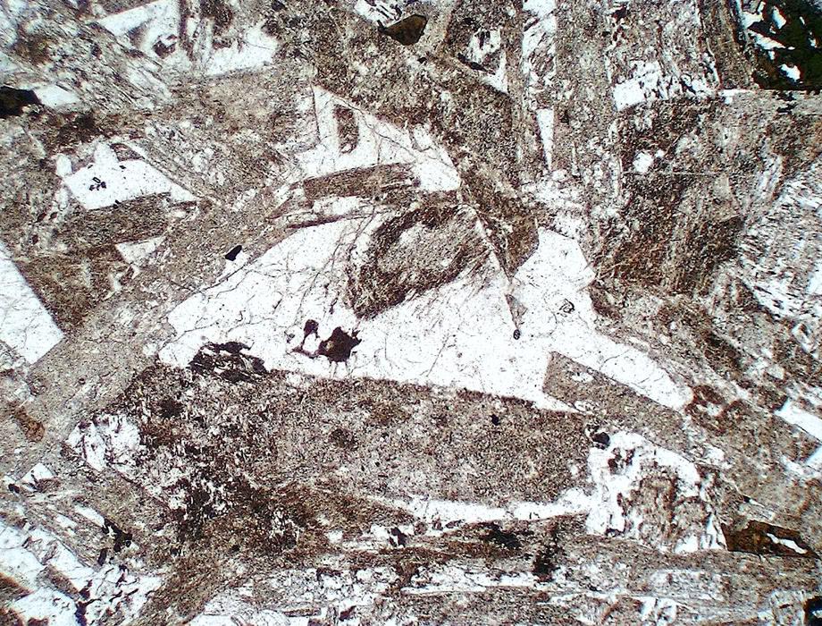 Cristales de analcima localizados entre cristales de feldespato alcalino en una sienita (nefelina, aegirina, arfvedsonita).