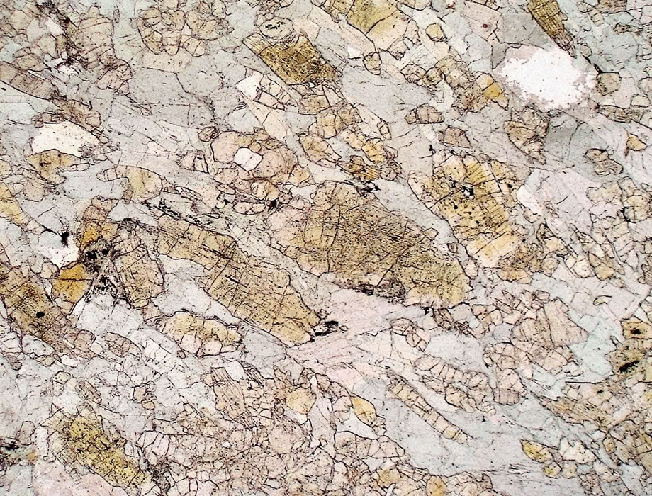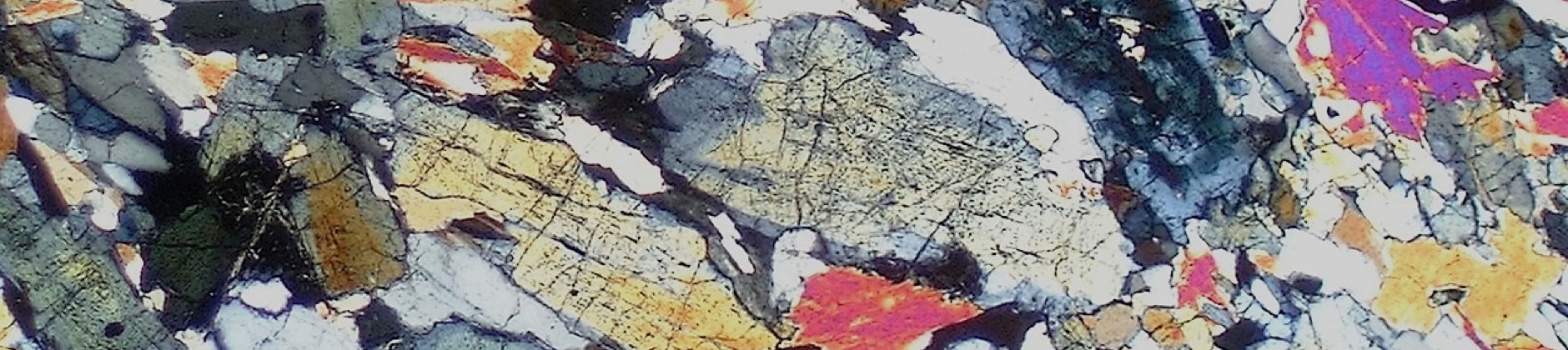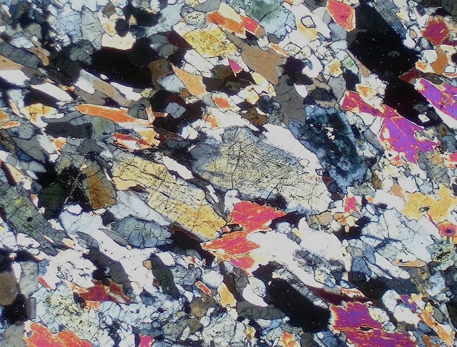 Misma zona, con polarizadores cruzados. Los colores de interferencia bajos indican una composición próxima al término clinozoisita.
