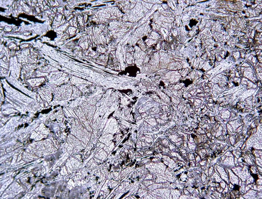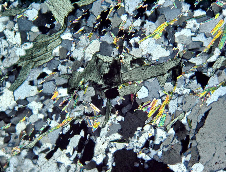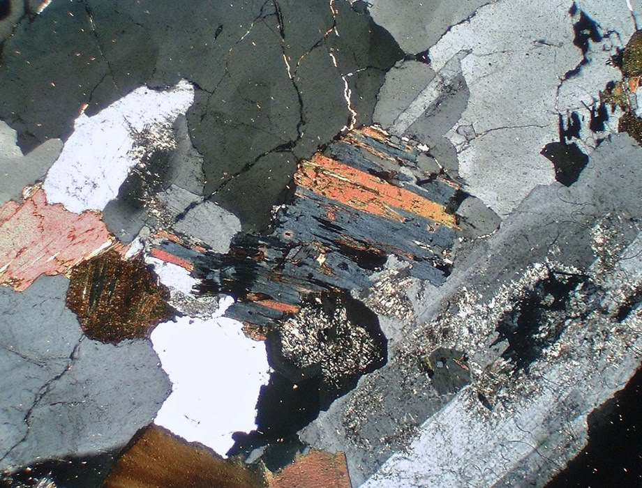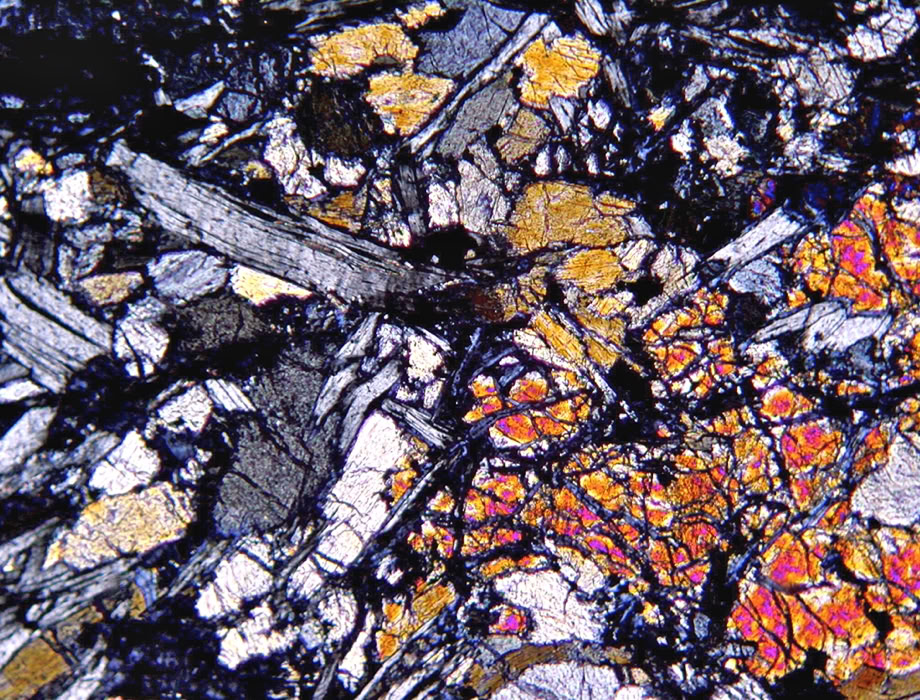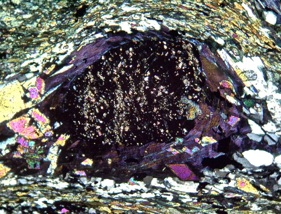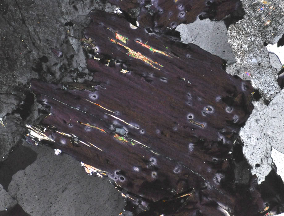 Misma zona, con polarizadores cruzados mostrando colores anómalos de interferencia (azul-violeta).