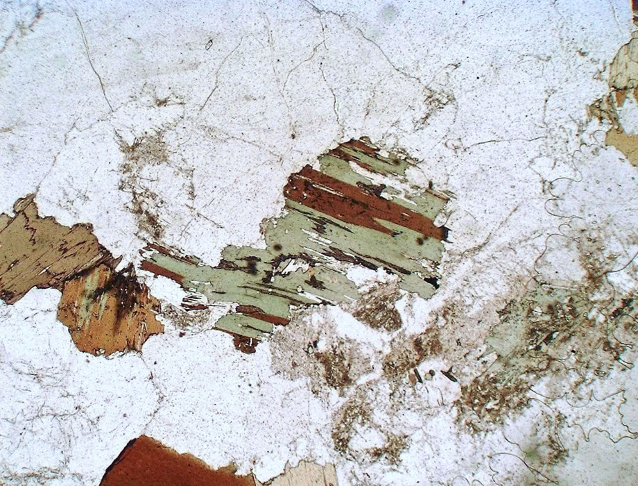 Clorita formada por alteración de biotita en un granito (cuarzo, microclina, plagioclasa parcialmente alterada).