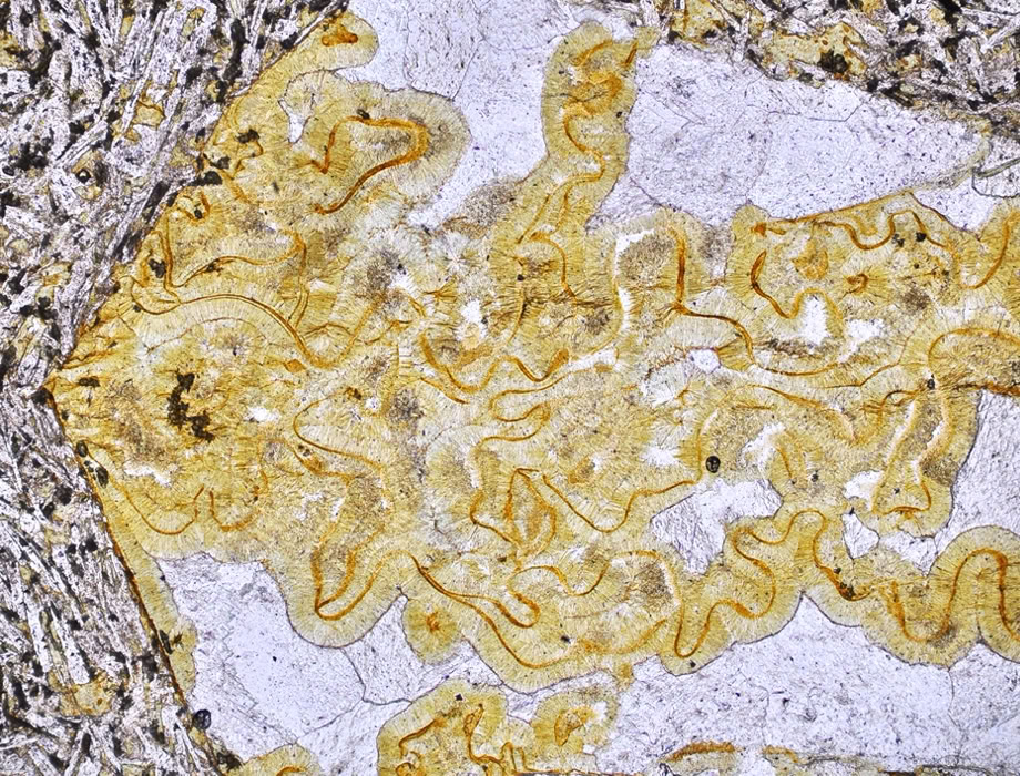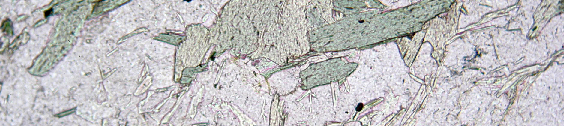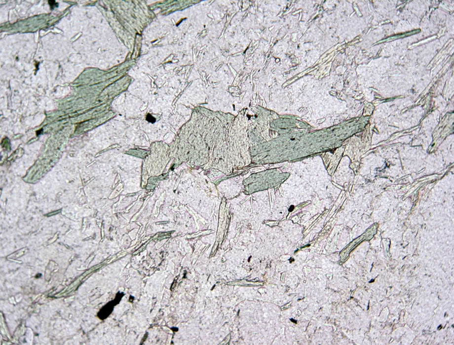 Clorita amarillo-verdosa junto a calcita, formadas por alteración, en una roca volcánica (plagioclasa, augita, calceta, minerales opacos).