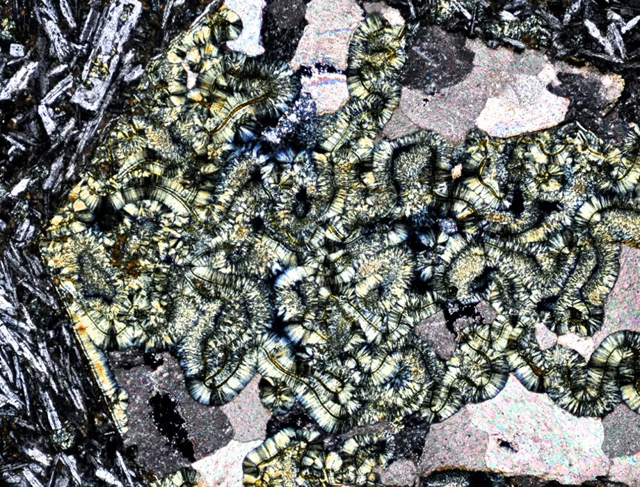 Clorita formadas por alteración de biotita, en una cavidad miarolítica de una granodiorita (cuarzo, plagioclasa, biotita, feldespato potasico, turmalina tipo chorlo, epidota, clorita, titanita, minerales opacos, zircón).