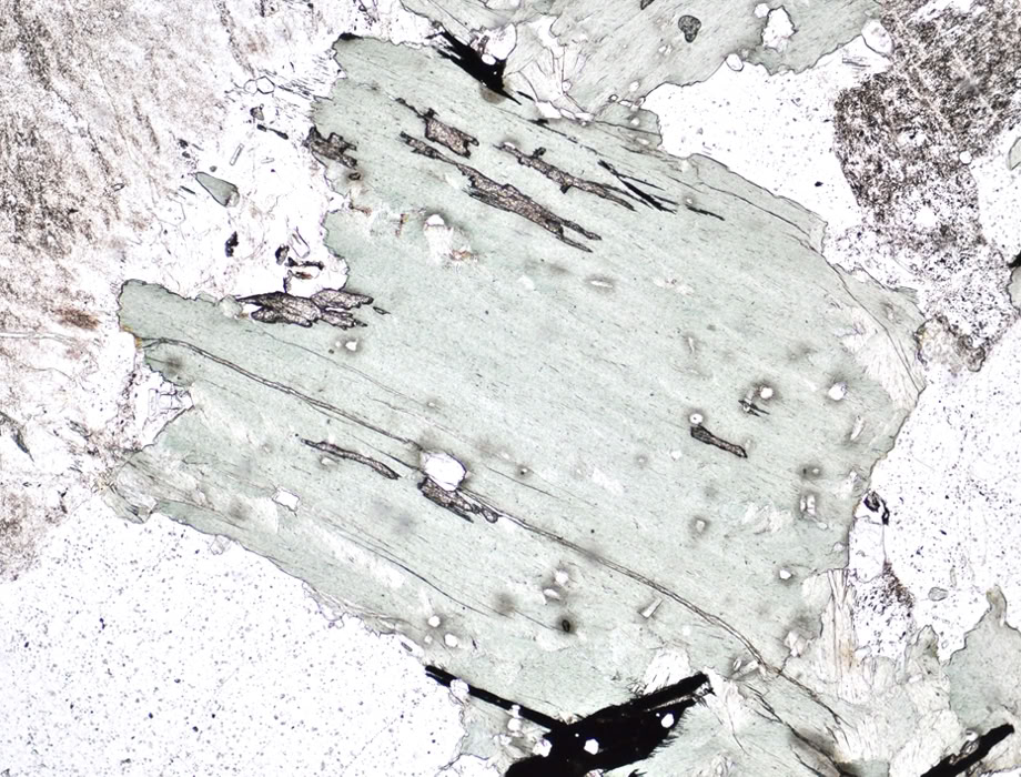 Clorita incolora en una roca ultrabásica (olivino, serpentina y ortopiroxeno).