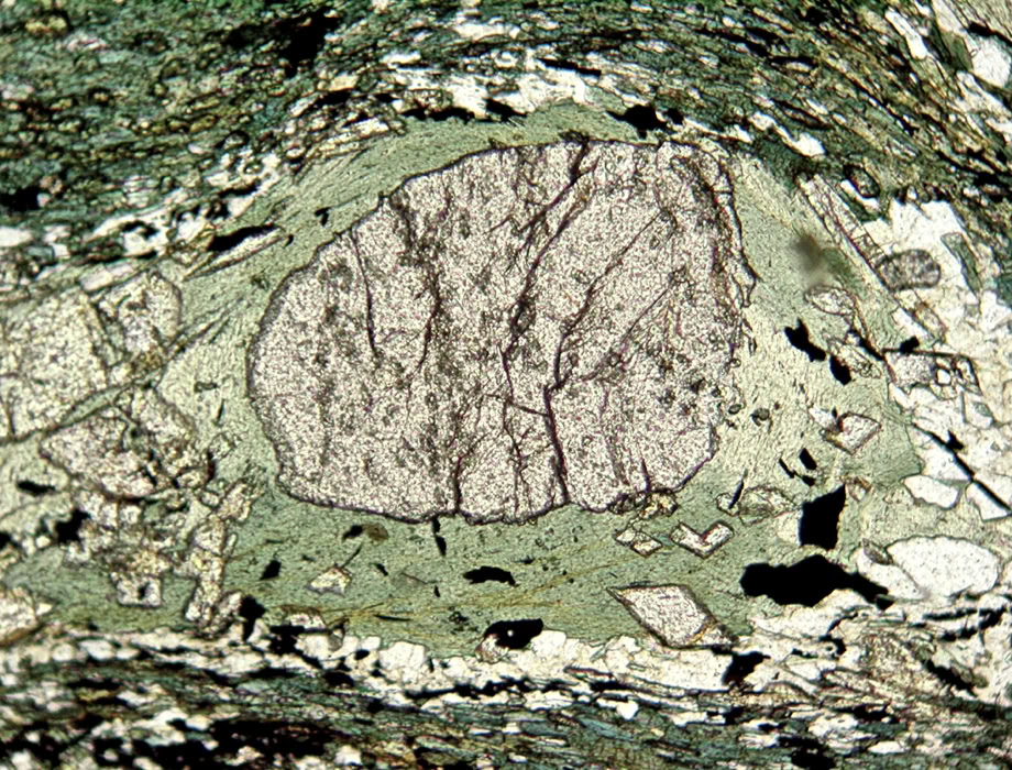 Clorita rodeando a un cristal de granate en una roca metamórfica (cristales automorfos de epidota, anfíboles, cuarzo y minerales opacos).