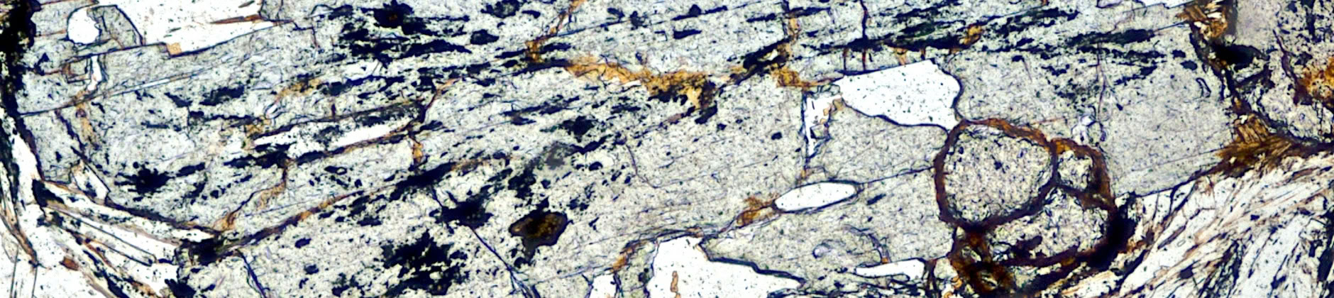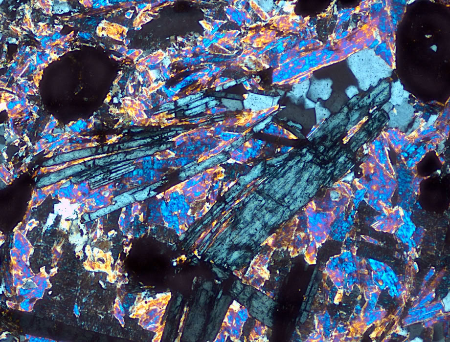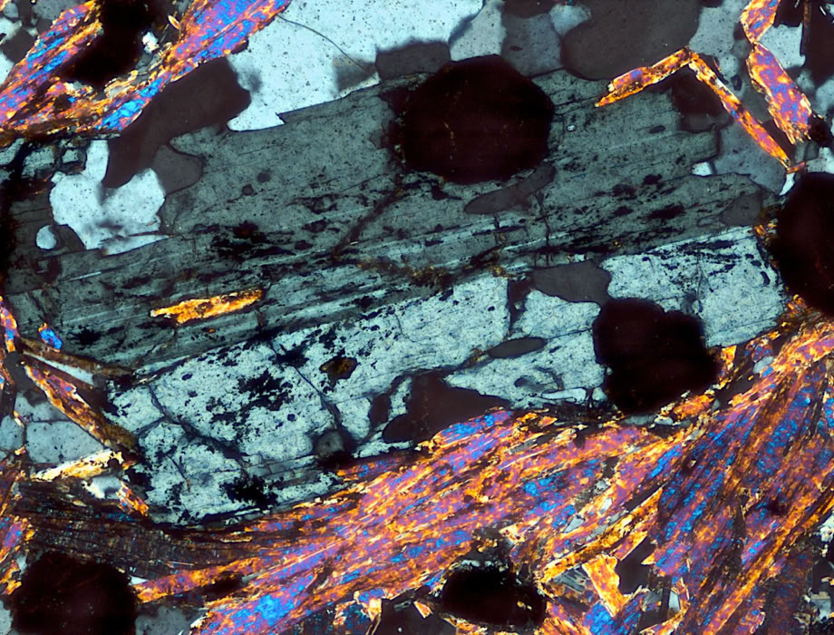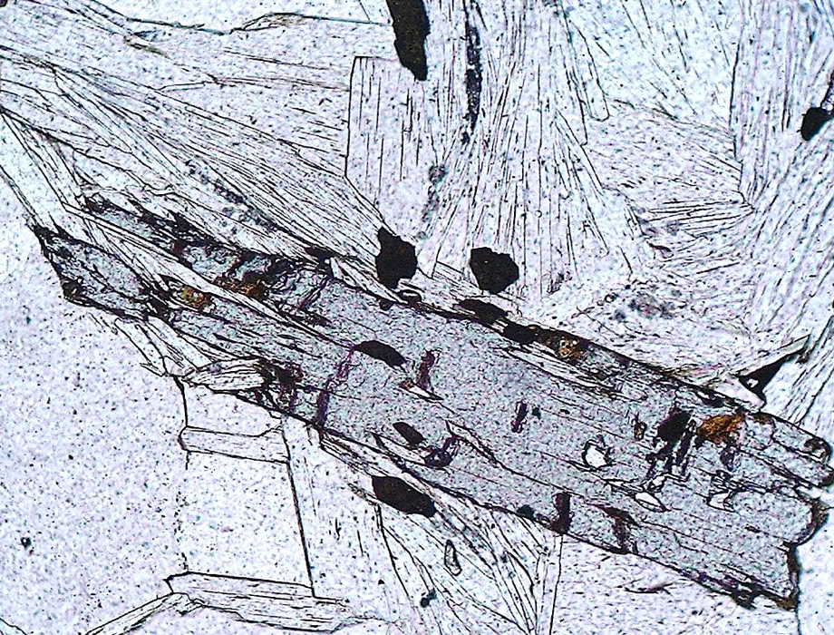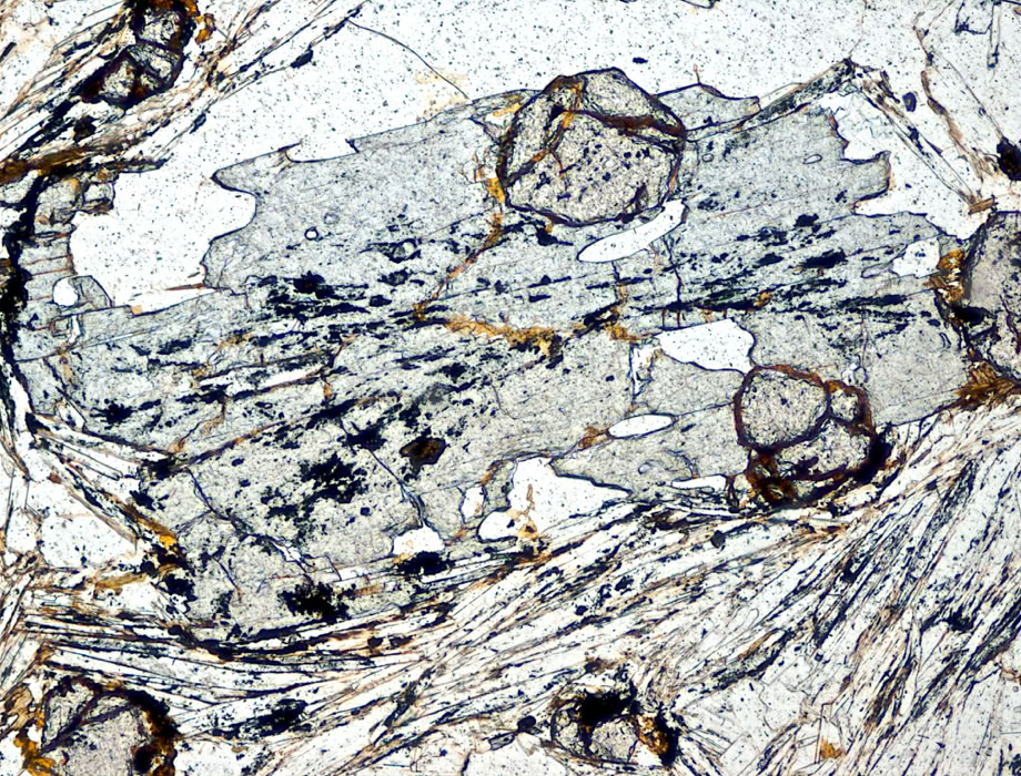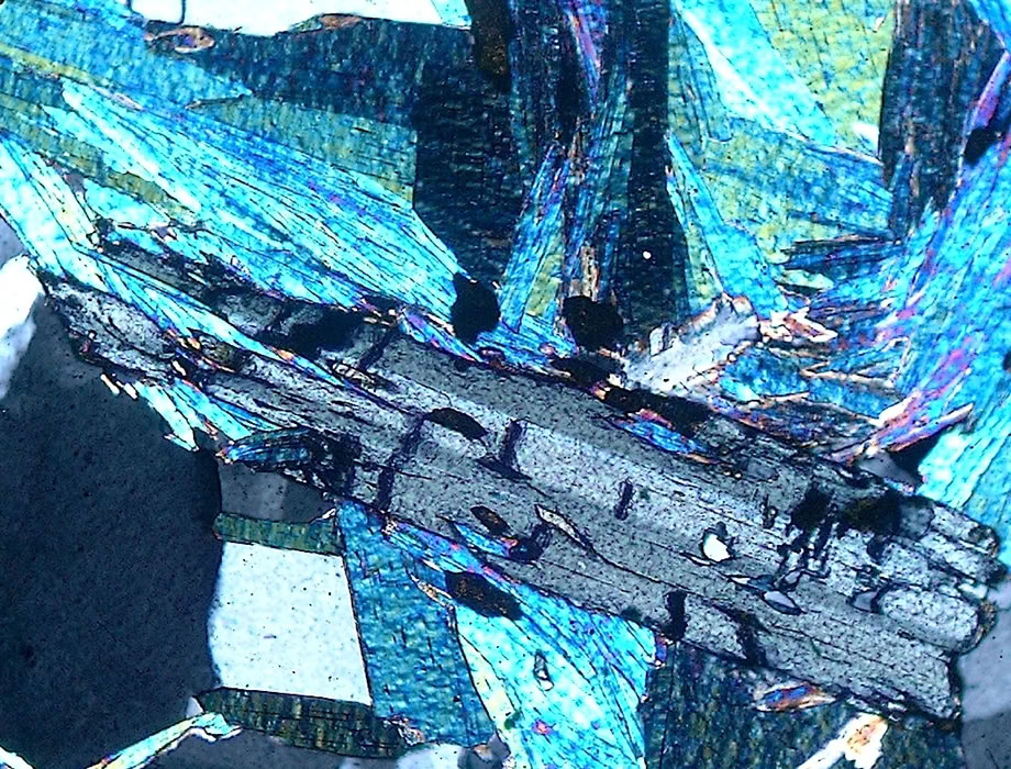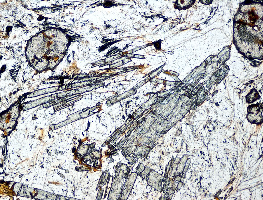 Varios cristales de hábito alargado de cloritoide en un esquisto (cuarzo, moscovita, granate, cianita, clorita, rutilo, min. opacos).