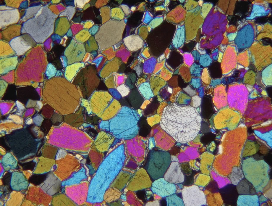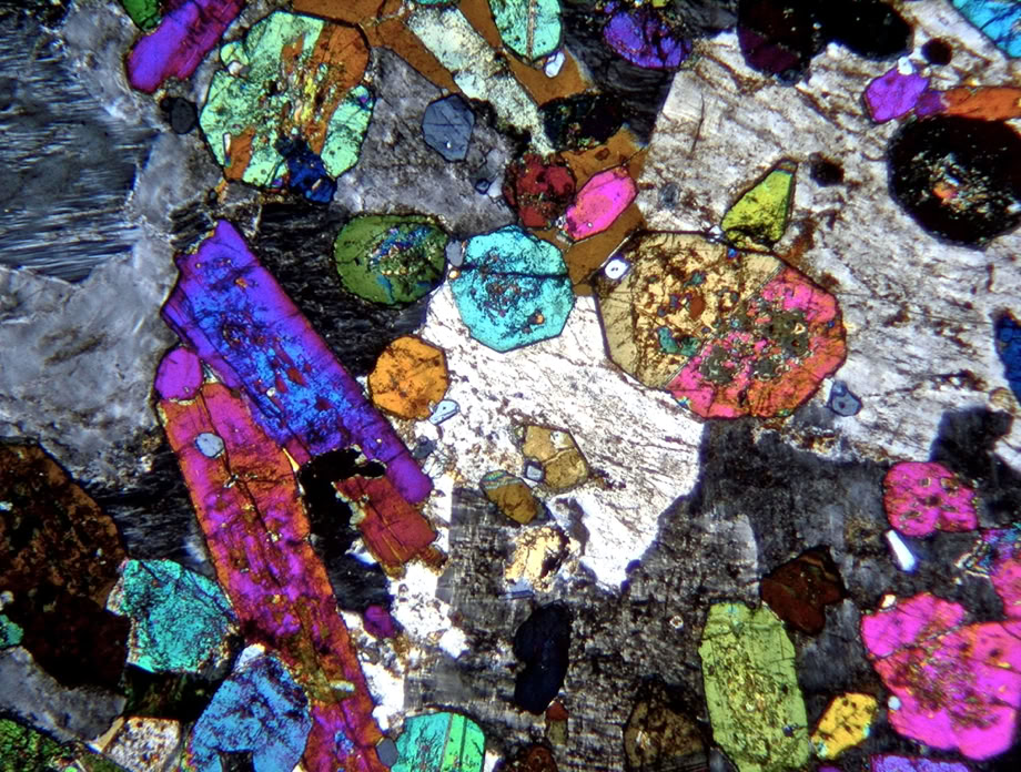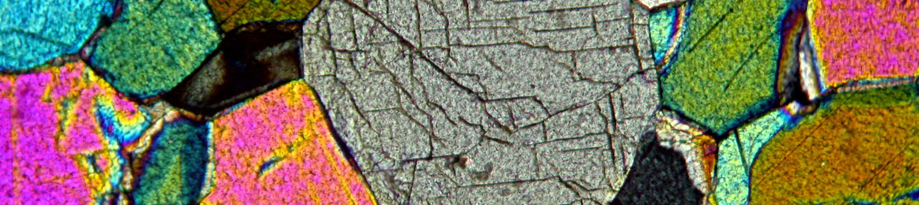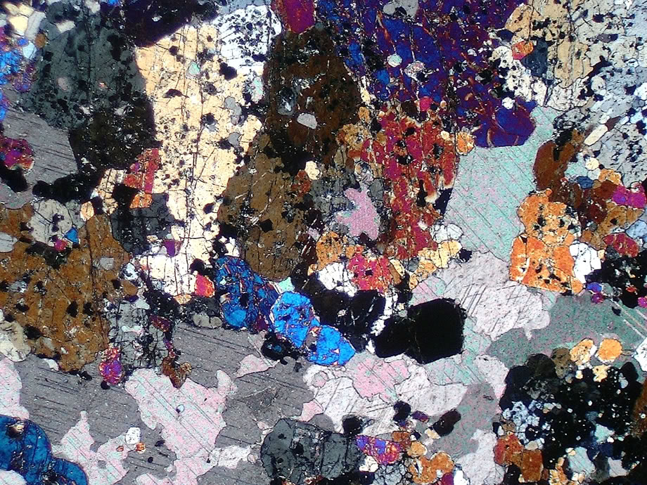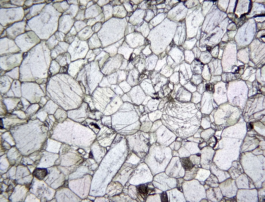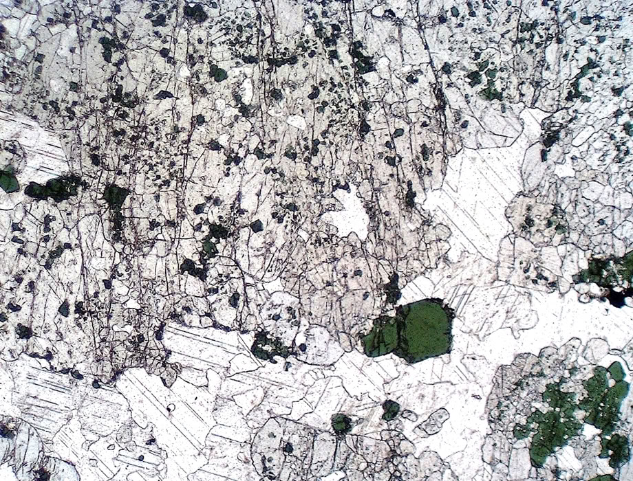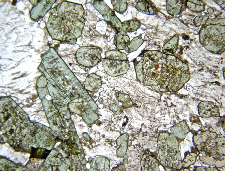 Granos subautomorfos de diópsido en un skarn-diopsidita. Algunos granos muestran una ligera coloración verdosa en las zonas de borde debidas, posiblemente, a un ligero enriquecimiento en Fe.