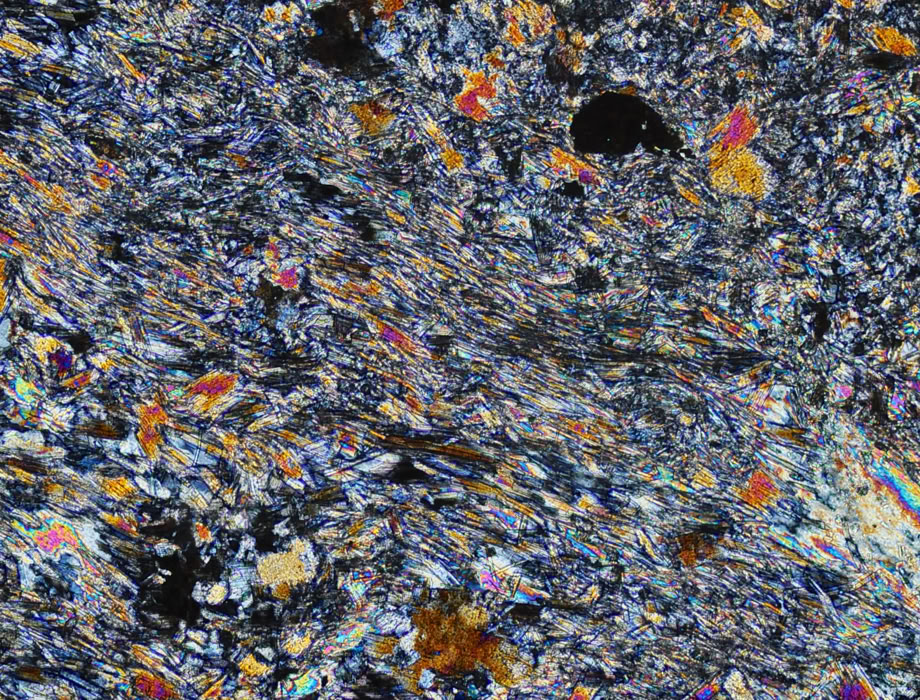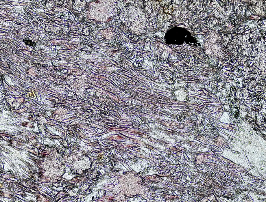 Cristales aciculares y agregados fibrosos de dumortierita de color rosa-lila en una roca metamórfica metasomatizada (cuarzo, moscovita, rutilo).