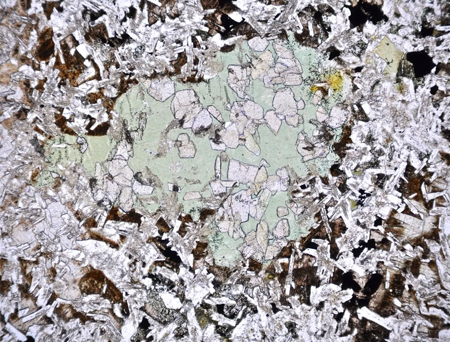 Epidota de color amarillento en una vacuola de un basalto (plagioclasa, piroxeno, clorita, prehnita, pumpellyíta).