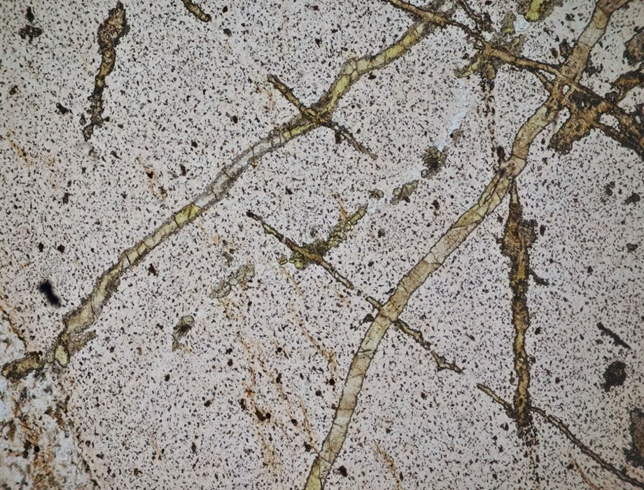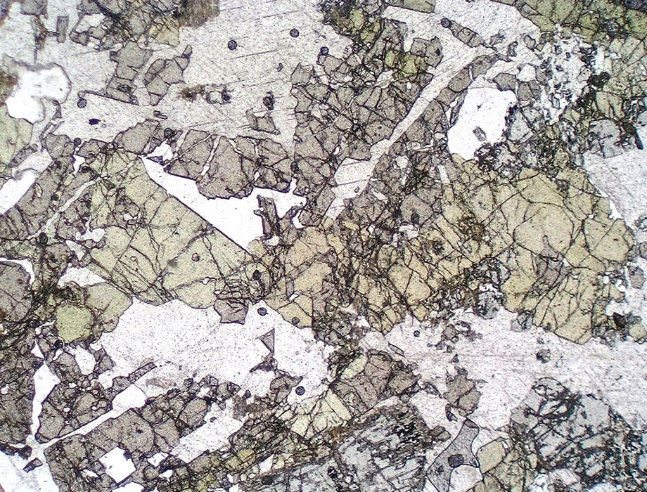 Epidota de tono amarillentos rellenando fracturas (actinolita, cuarzo, titanita, opacos). Con relieve alto.