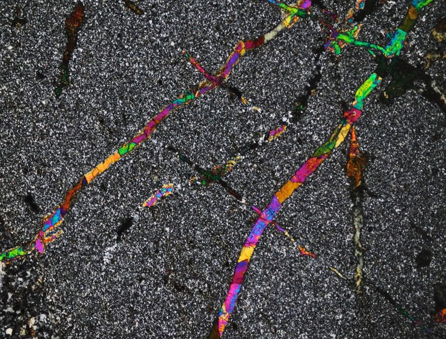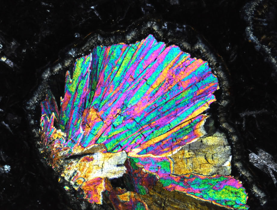 Misma zona, con polarizadores cruzados. Colores de interferencia muy altos.