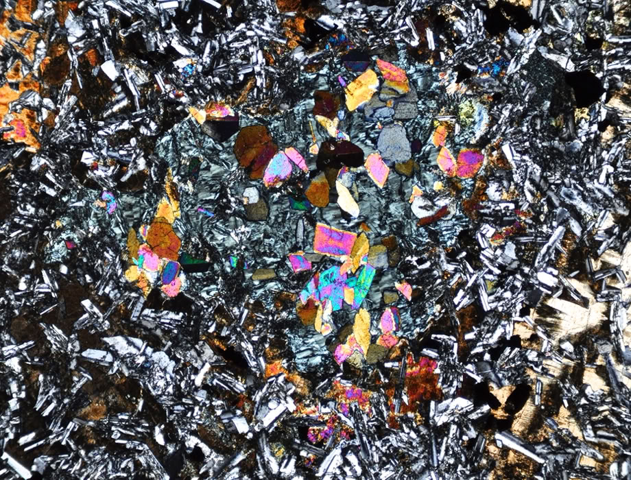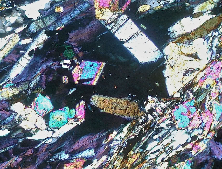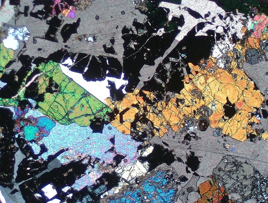 Misma zona, con polarizadores cruzados. Colores de interferencia muy altos y variando en un mismo grano (manto de arlequín).