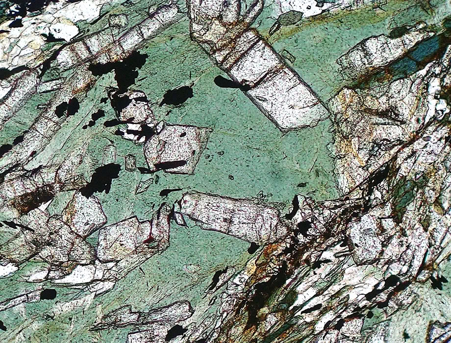 Misma zona, con polarizadores cruzados. Se observan los colores de interferencia altos de la epidota.